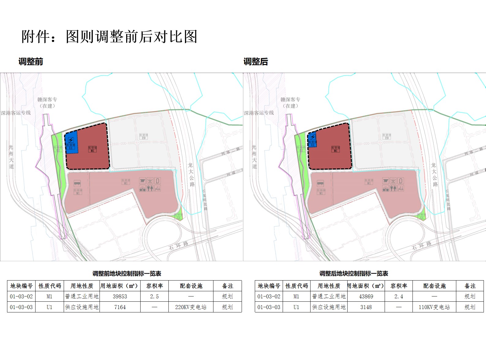01-03-03地块用地面积调整为3148平方米,规划用地性质供应设施用地(U1)不变,配套设施调整为110kV变电站。