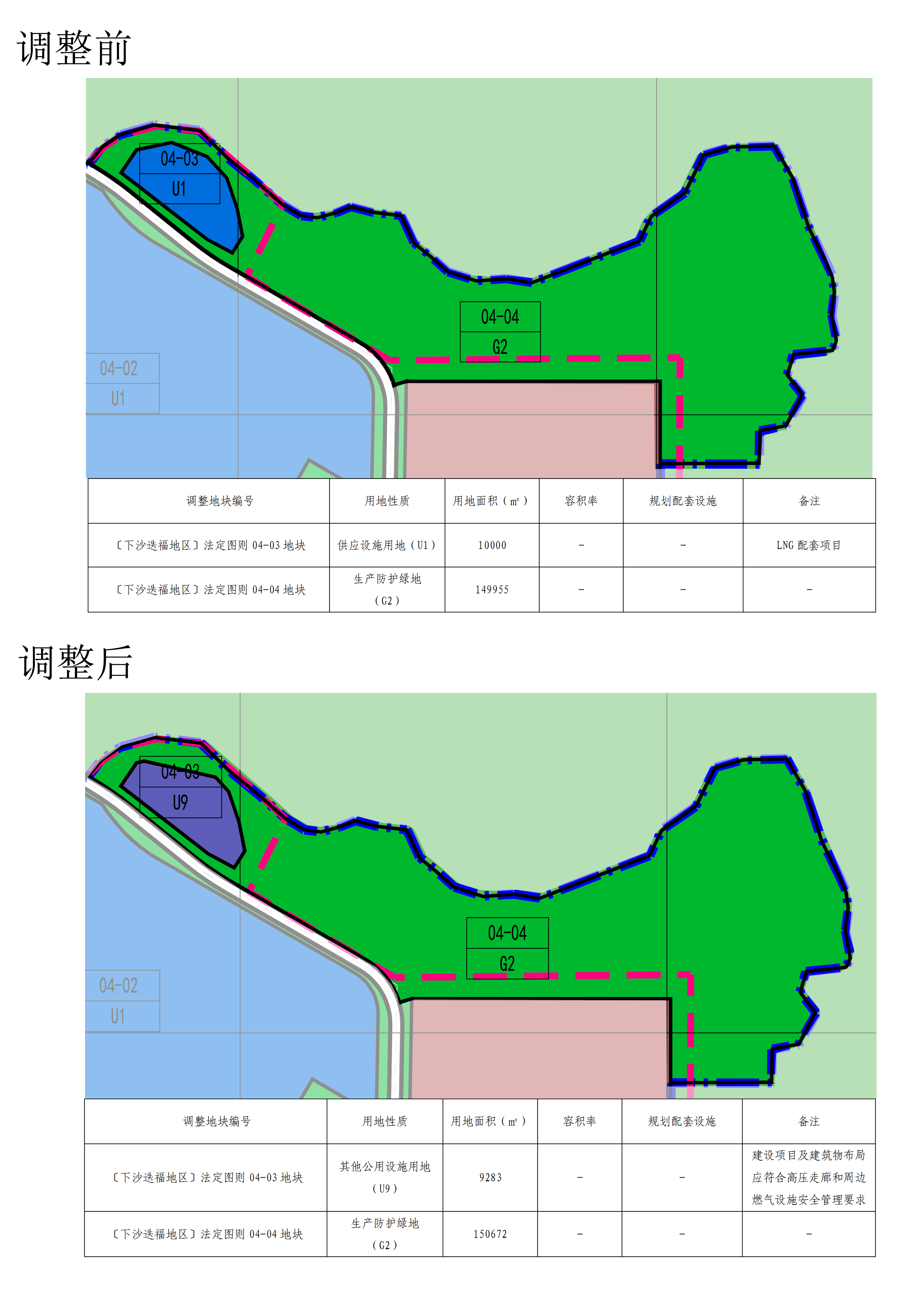 [下沙迭福地区]法定图则04-03地块规划用地性质为供应设施用地,用地面积为10000平方米,备注为“LNG配套项目”;04-04地块规划用地性质为生产防护绿地,用地面积为149955平方米。