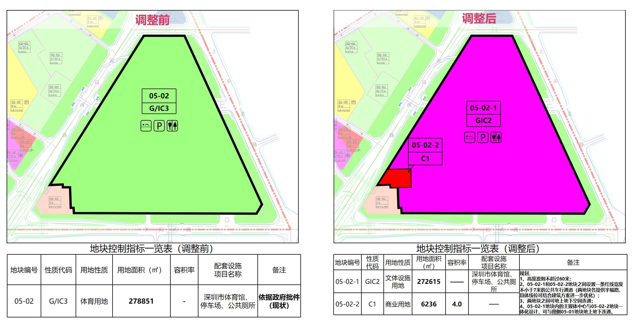 调整后,05-02-1地块用地面积272615平方米,规划用地性质:文体设施用地(GIC2),容积率:-,配套设施项目名称:深圳市体育馆、停车场、公共厕所,备注:规划,1、高度原则上不超过60米;2、05-02-1和05-02-2地块之间设置一条红线宽度不小于7米的公共车行通道(两地块各提供半幅路,具体线位可结合建筑方案进一步优化);3、两地块之间可地上地下空间连通;4、05-02-1地块内的主媒体中心与05-02-2地块一体化设计,可与南侧05-01地块地上地下连通。05-02-2地块用地面积6236平方米,规划用地性质:商业用地(C1),容积率:4.0,配套设施项目名称:-,备注与05-02-1地块一致。