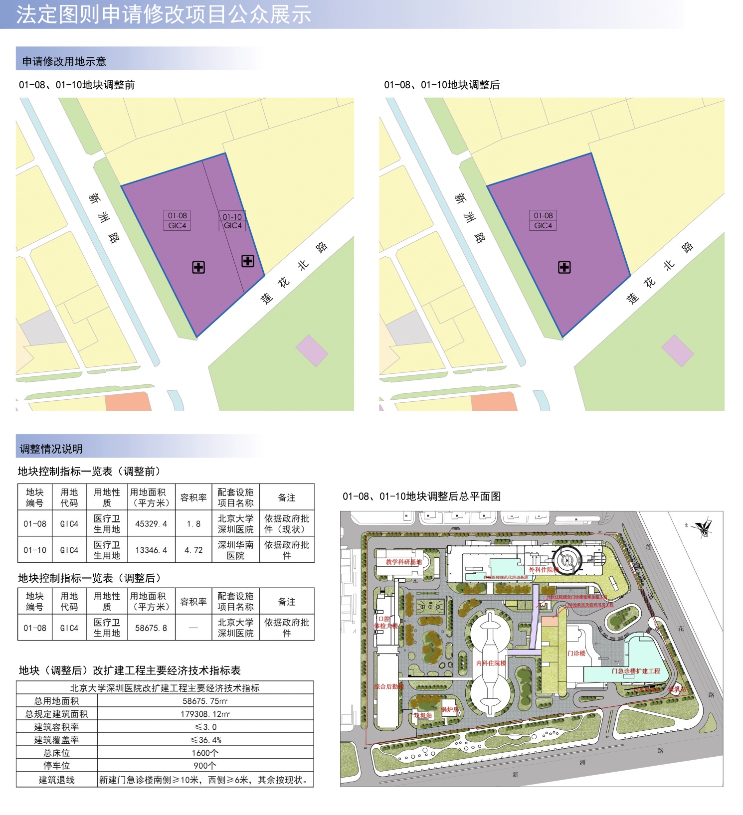 市卫生和计划生育委员会申请北京大学深圳医院改扩建工程,拟扩建门急诊楼17880平方米(地上11880平方米,地下6000平方米);在外科住院楼屋顶加建住院医师规范化培训用房950平方米;将口腔体检大楼首层自行车停车库及架空部分改造成体检大堂,新建连接科教楼及综合楼的连廊928平方米;在门诊楼东侧加建两层钢结构建筑600平方米;在原外科住院楼连廊上加建一层钢结构连廊1000平方米。此次改扩建共增加规定建筑面积21358平方米。该事项涉及[莲花北、冬瓜岭地区]法定图则01-08、01-10地块规划调整,现依据《中华人民共和国城乡规划法》和《深圳市城市规划条例》等相关规定,对该规划调整事项公开展示如下: