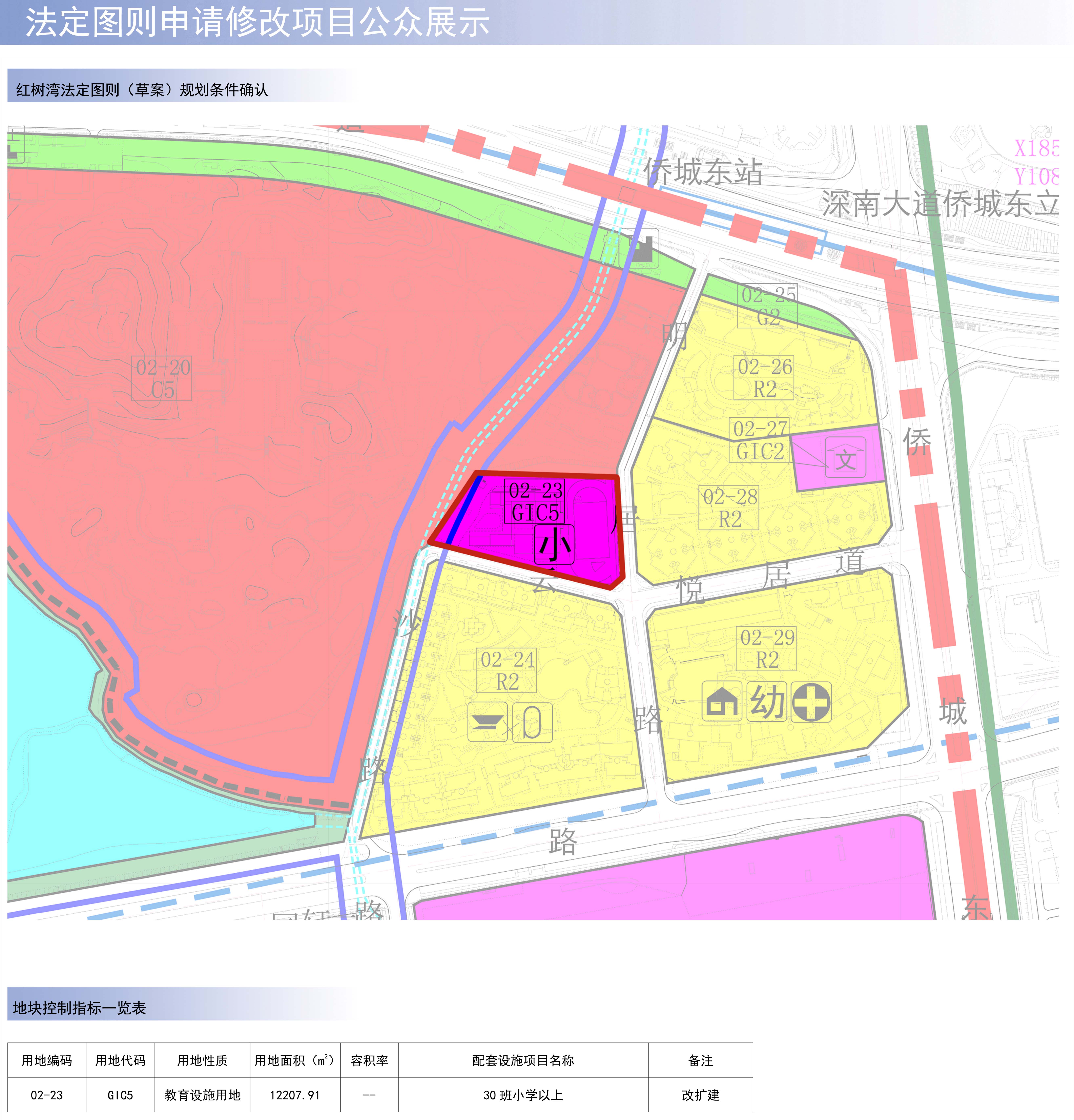 (一)拟对尚未生效的[红树湾地区]法定图则(草案)02-23地块进行规划条件确认。02-23地块用地面积12207.91平方米,规划用地性质为教育设施用地(GIC5),容积率为-,配套设施为30班小学以上,备注为改扩建。(详附图)