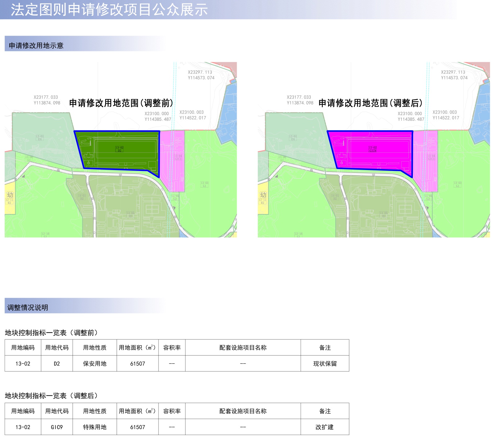 拟对[梅林地区]法定图则(修编)13-02地块进行规划调整,并按《深圳市城市规划标准与准则》(2014)表达。规划调整后13-02地块规划用地性质为特殊用地(GIC9),备注为规划,其余规划指标不变。