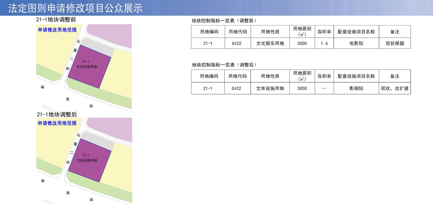 [石厦益田地区]法定图则21-1地块用地性质为文化设施用地,调整后按新“深标”表达为文体设施用地,容积率不再作具体规定,配套设施由电影院调整为影剧院,备注由现状保留调整为现状、改扩建。