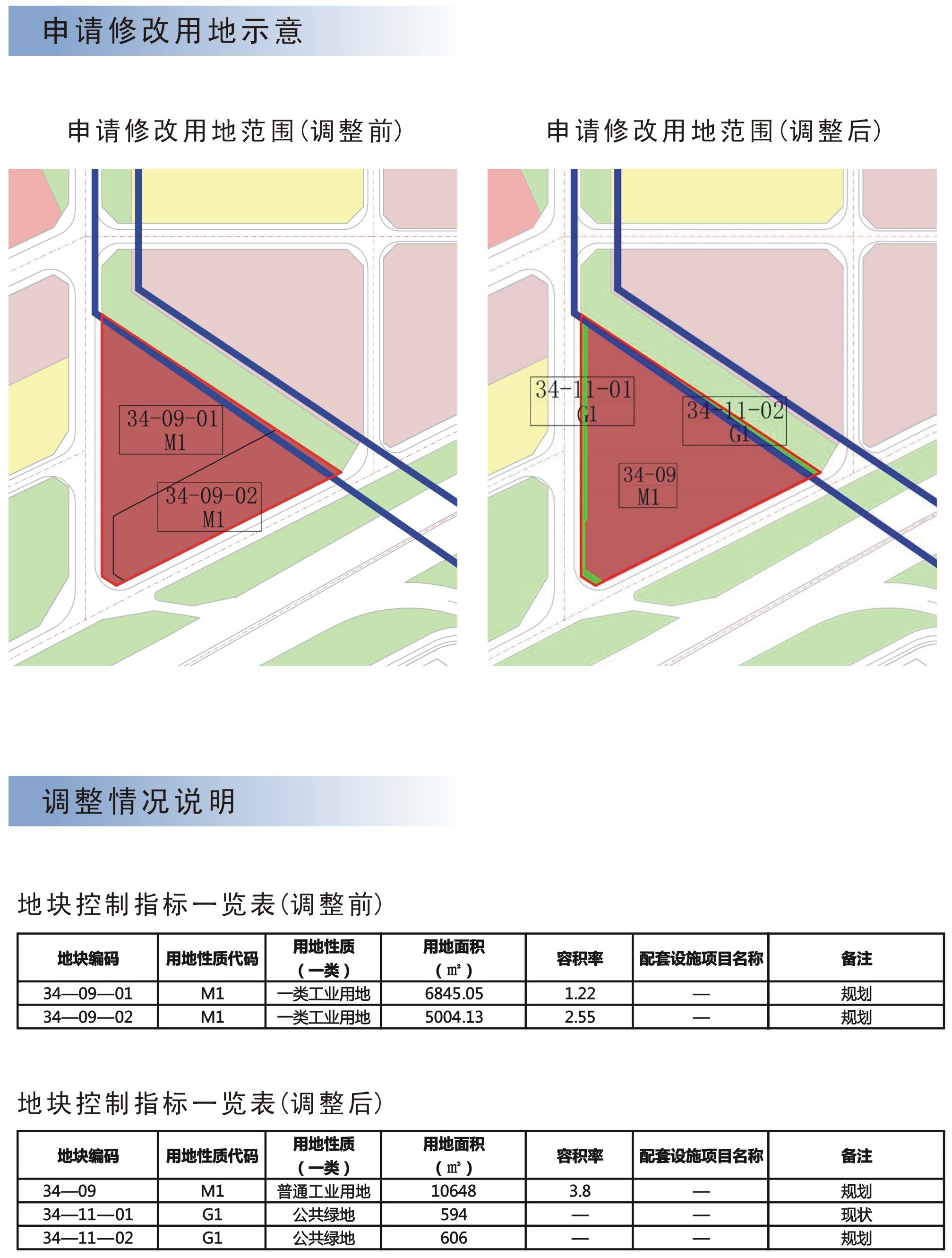 合并后,拆分为34-09、34-11-01、34-11-02地块:34-09地块用地性质为普通工业用地,用地面积为10649平方米,容积率为3.8;34-11-01地块用地性质为公园绿地,用地代码为G1,用地面积为594平方米,备注为现状;34-11-02地块用地性质为公园绿地,用地代码为G1,用地面积为606平方米,备注为规划。