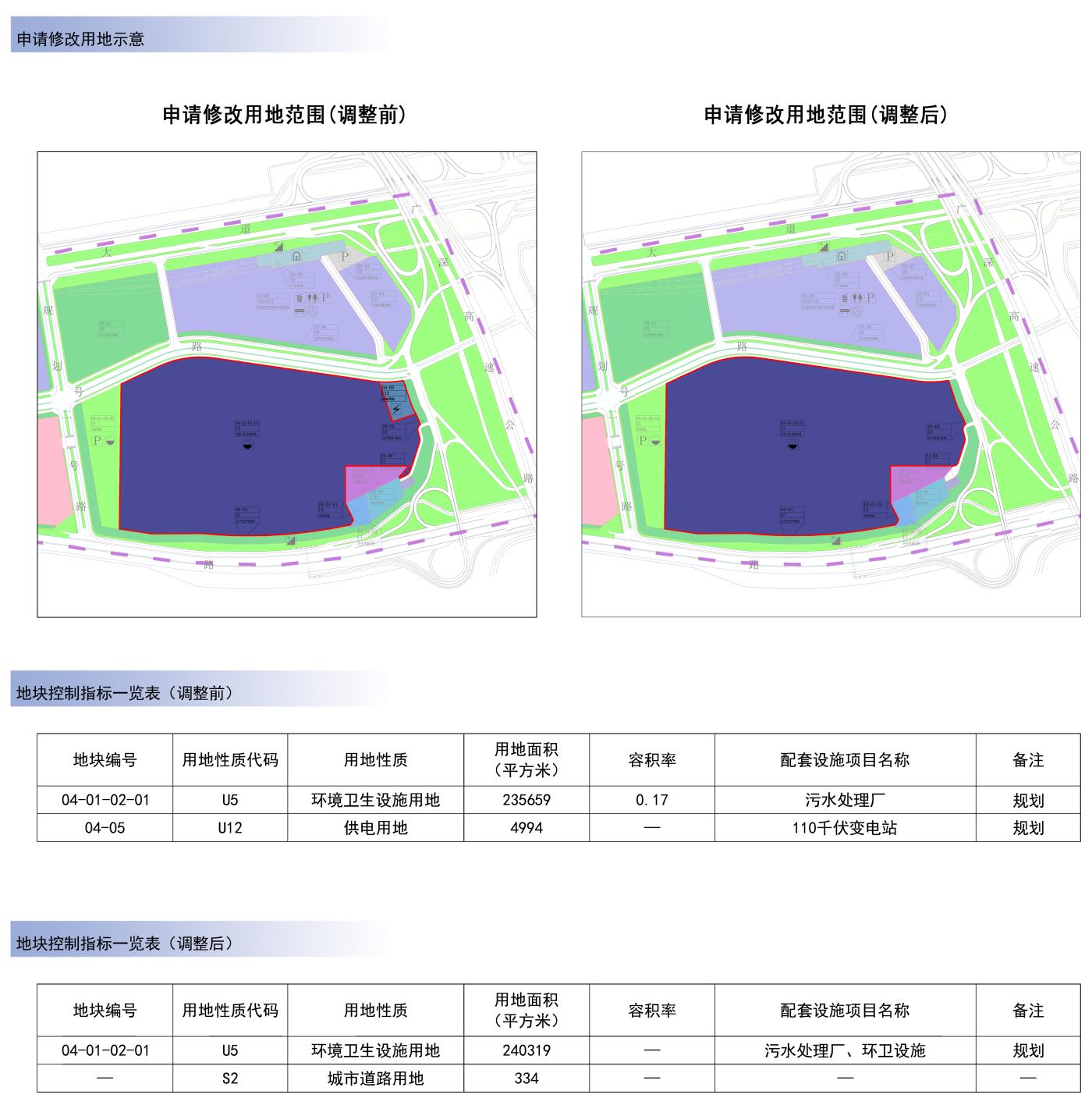 将04-05地块并入04-01-02-01地块,调整后04-01-02-01地块用地面积为240319平方米,用地性质为环境卫生设施用地(U5),容积率为“-”,配套设施项目:“污水处理厂、环卫设施”,其余规划指标不变。同时优化周边道路,新增道路面积334平方米。