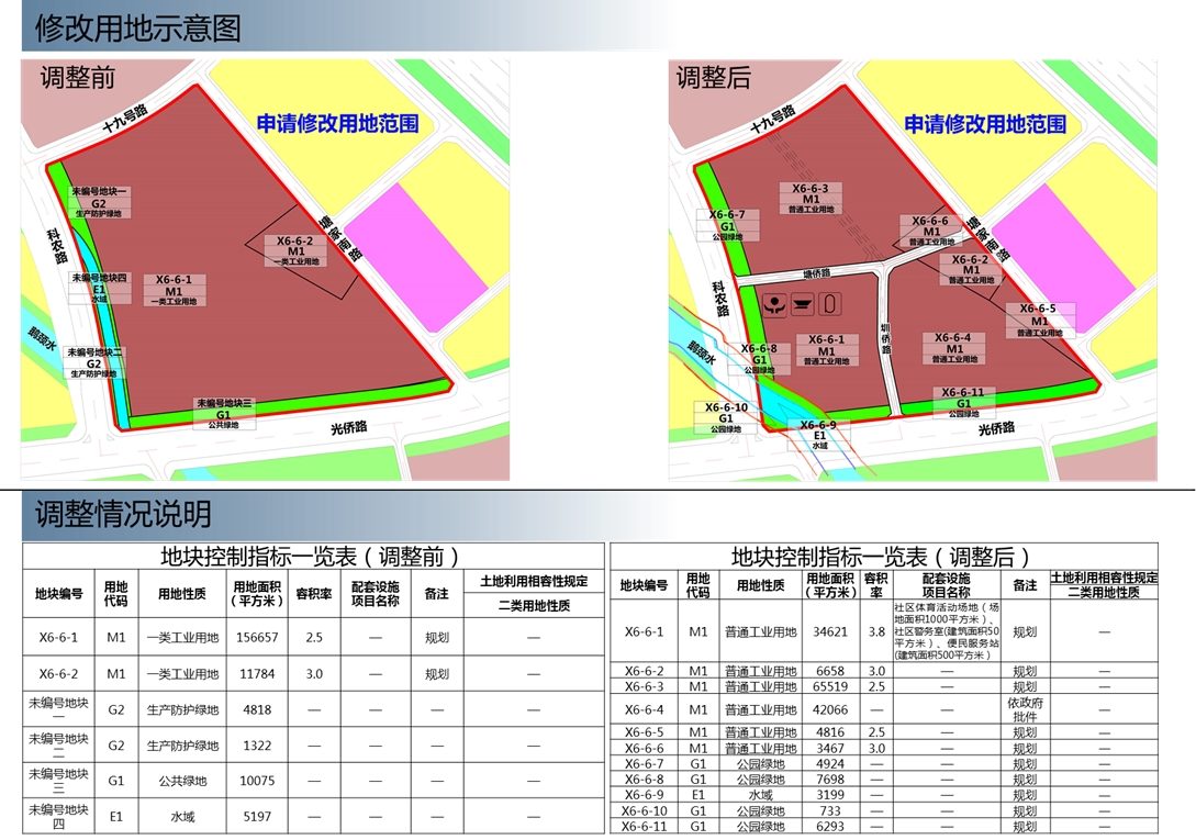 (二)用地调整。根据河道蓝线及河道管理范围线落实鹅颈水(科农路-光侨路)线位走向,并结合调整后路网重新调整所涉各地块边界并核定用地面积,将X6-6-1地块重新划分为X6-6-1、X6-6-3、X6-6-4、X6-6-5地块,补充用地编号X6-6-7、X6-6-8、X6-6-9、X6-6-10、X6-6-11;将X6-6-2地块重新划分为X6-6-2、X6-6-6地块。调整后情况如下: