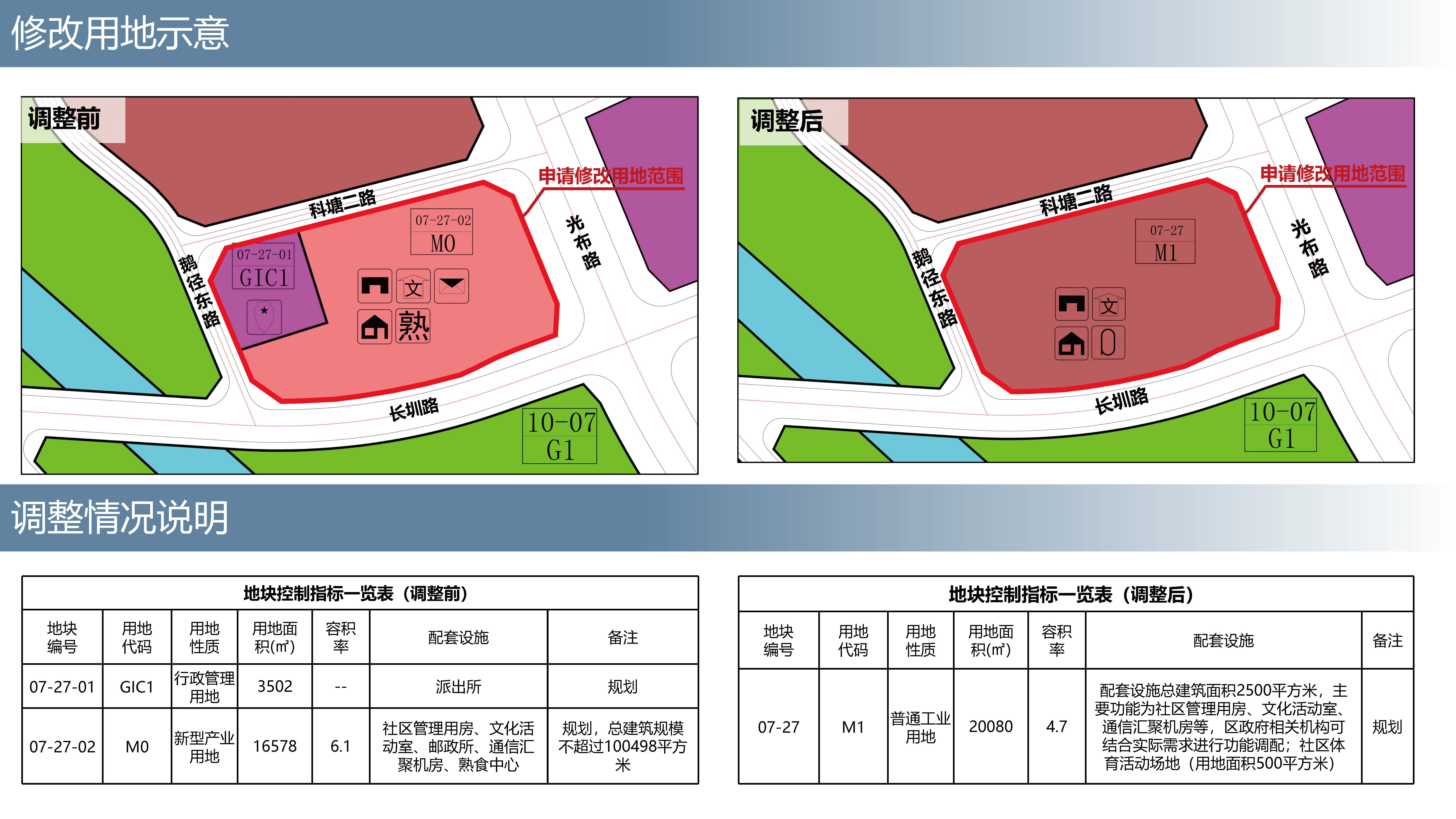 将07-27-01地块和07-27-02地块合并为07-27地块,用地性质调整为普通工业用地(M1),用地面积为20080平方米,容积率为4.7,配套设施:配套设施总建筑面积2500平方米,主要功能为社区管理用房、文化活动室、通信汇聚机房等,区政府相关机构可结合实际需求进行功能调配;社区体育活动场地(用地面积500平方米),备注为“规划”。