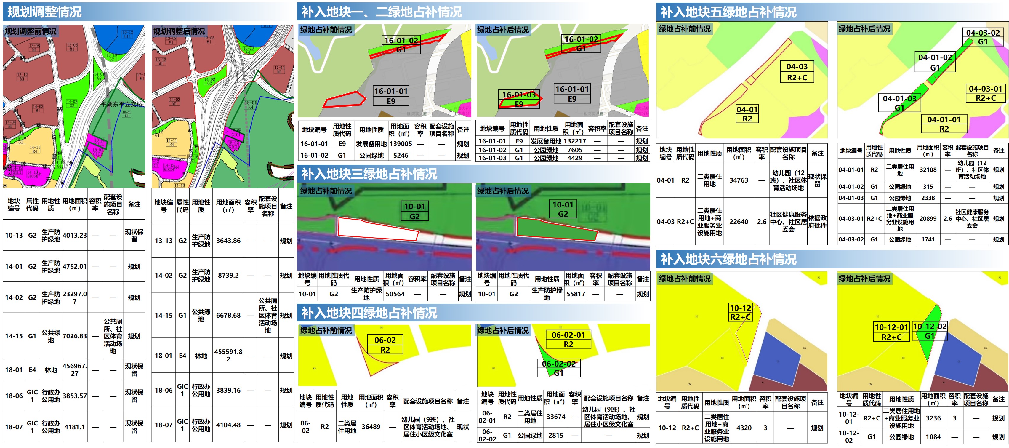 (五)补入地块六:调整前【平湖中心地区】法定图则10-12地块,用地面积为4320平方米,用地性质为二类居住用地+商业服务业设施用地(R2+C),容积率3,备注规划,调整后【平湖中心地区】法定图则10-12-01地块用地面积3236平方米,用地性质不变,容积率4,备注规划、10-12-02地块用地面积1084平方米,用地性质为公园绿地(G1),备注规划。