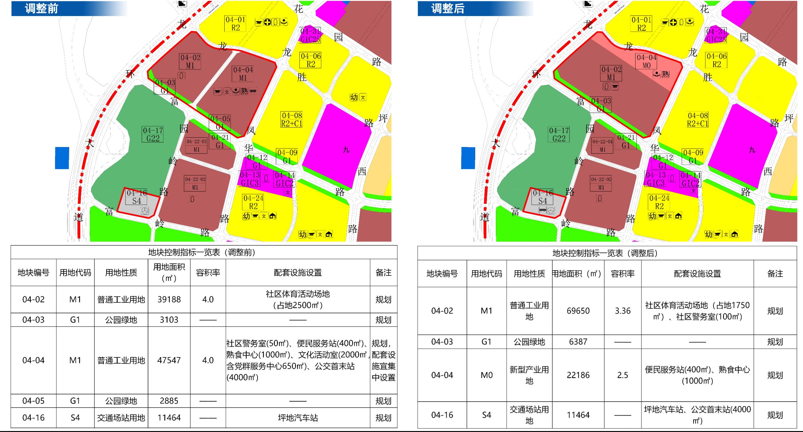 (二)地块划分为04-02、04-03、04-04、04-16地块,其中,04-02地块用地面积69650平方米,规划用地性质为普通工业用地;容积率为3.36,配套设施为社区体育活动场地(占地面积1750平方米)、社区警务室(建筑面积100平方米);04-03地块用地面积6387平方米,规划用地性质为公园绿地;04-04地块用地面积22186平方米,规划用地性质为新型产业用地,容积率为2.5,配套设施为便民服务站(建筑面积400平方米)、熟食中心(建筑面积1000平方米);04-16地块用地面积11464平方米,规划用地性质为交通场站用地,配套设施为公交首末站(建筑面积4000平方米)、坪地汽车站。地块均备注为“规划”。