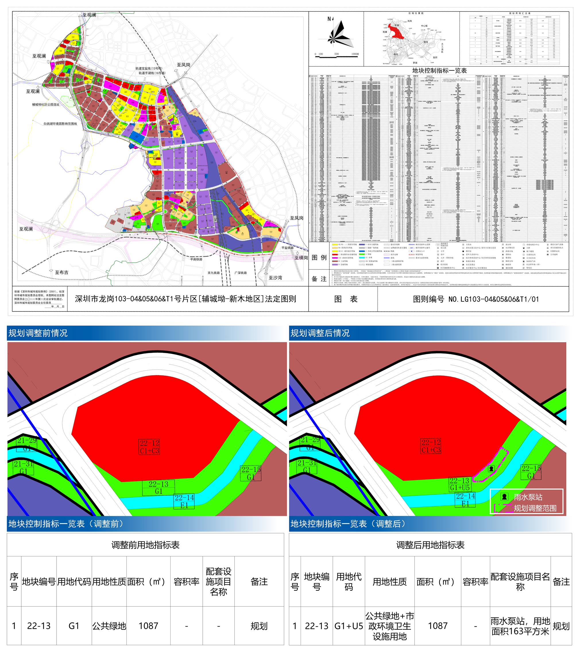 拟将[辅城坳-新木地区]法定图则22-13地块调整为公共绿地+市政环境卫生设施用地,用地面积保持不变,为1087平方米,容积率无,配套设施项目名称为“雨水泵站,用地面积163平方米”,备注为“规划”。