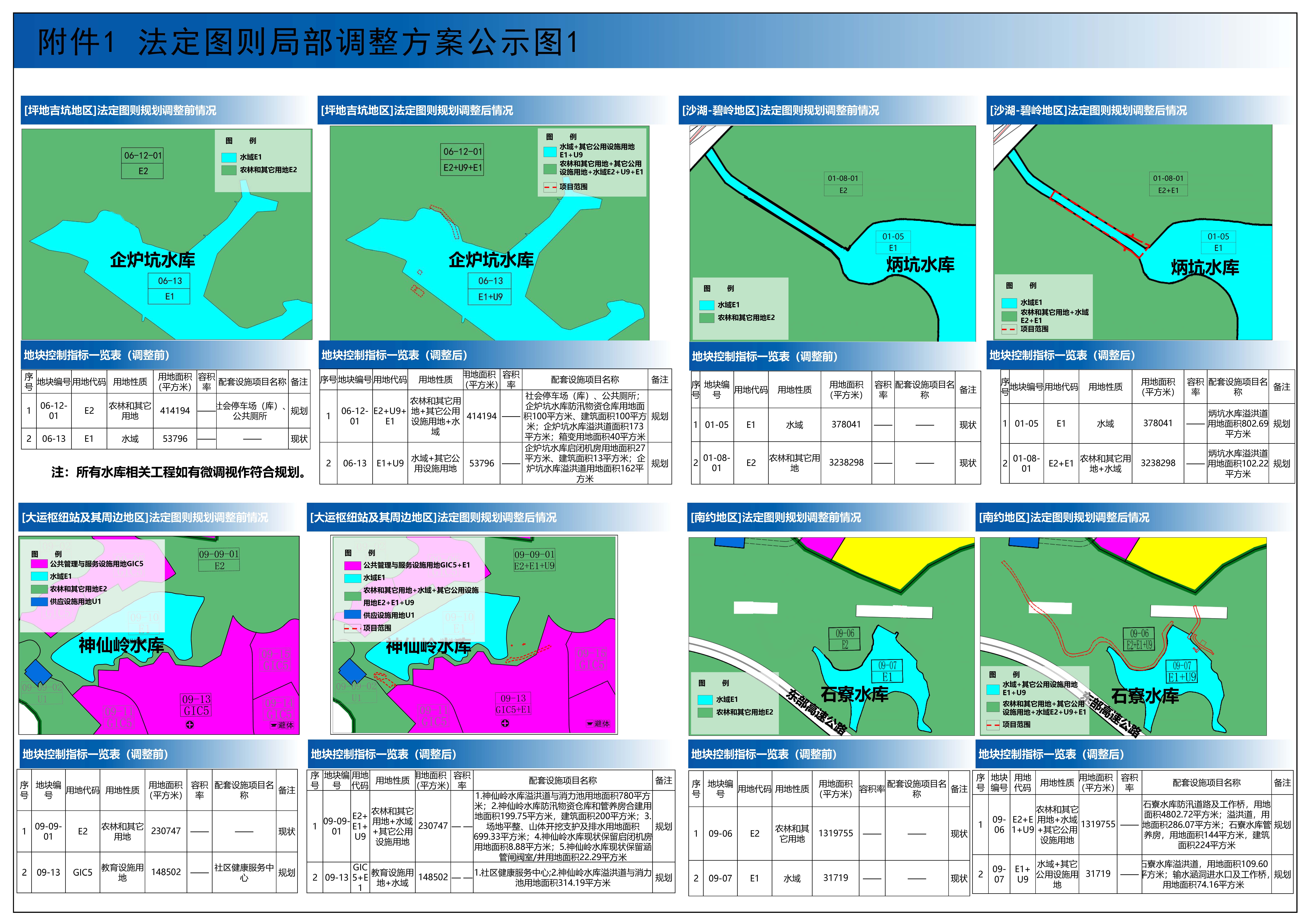 1.将[坪地吉坑地区]法定图则06-12-01地块调整为农林和其它用地+其它公用设施用地+水域(E2+U9+E1),用地面积保持不变,容积率无,配套设施项目名称为“社会停车场(库)、公共厕所;企炉坑水库防汛物资仓库用地面积100平方米、建筑面积100平方米;企炉坑水库溢洪道面积173平方米;箱变用地面积40平方米”,备注为“规划”;06-13地块调整为水域+其它公用设施用地(E1+U9),用地面积保持不变,容积率无,配套设施项目名称为“企炉坑水库启闭机房用地面积27平方米、建筑面积13平方米;企炉坑水库溢洪道用地面积162平方米”,备注为“规划”。