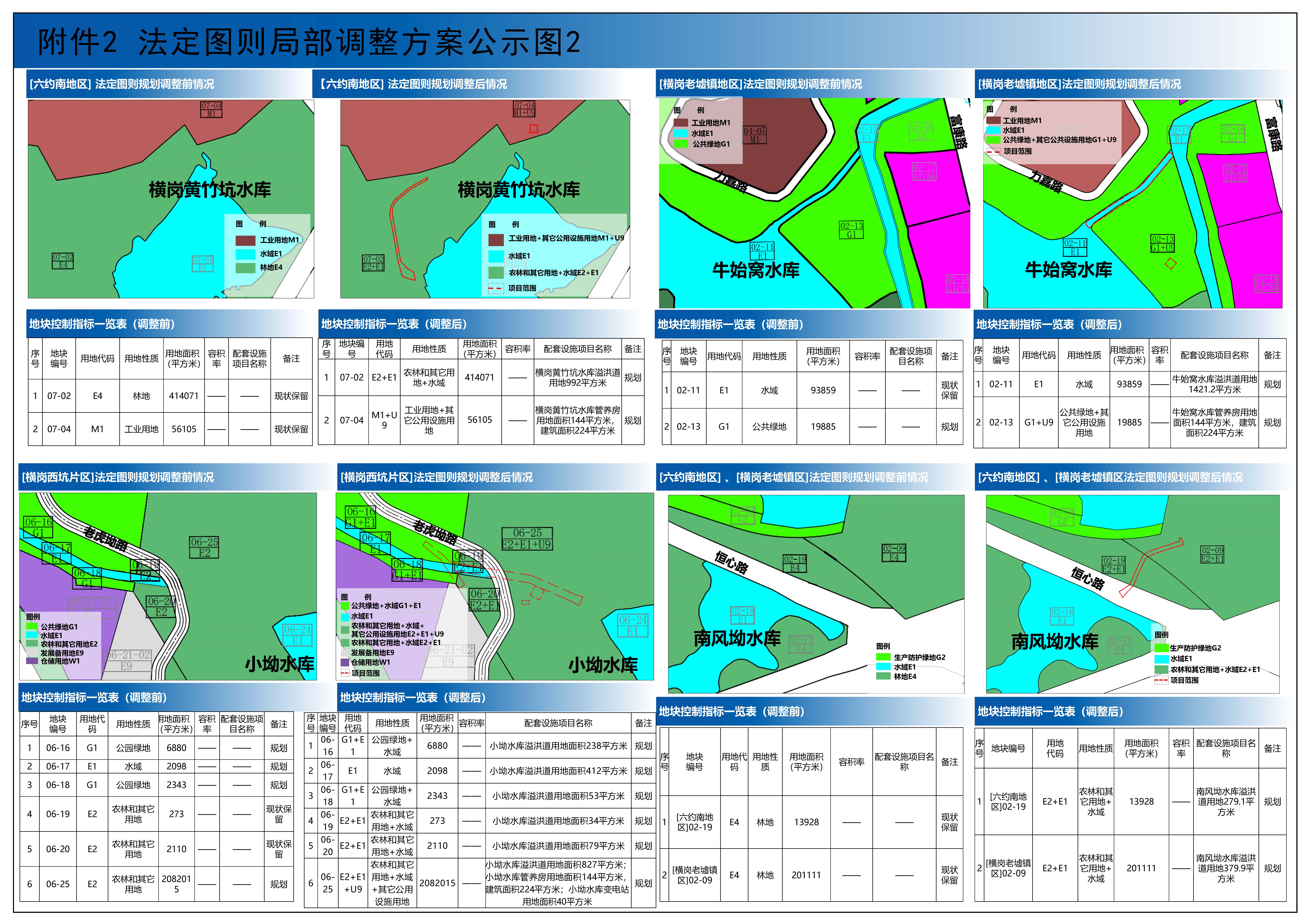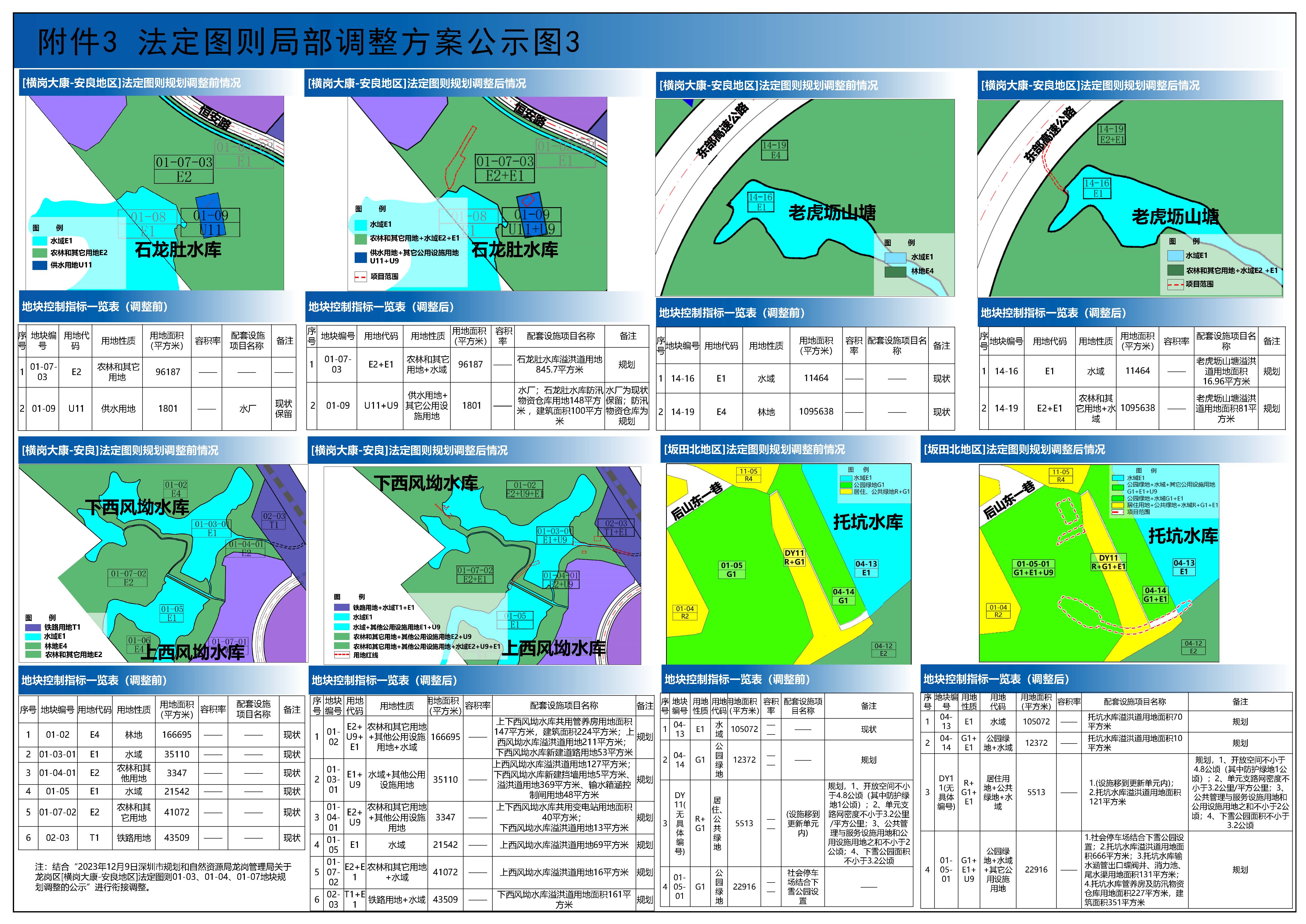 8.将[横岗大康-安良]法定图则01-02地块的用地性质调整为“农林和其它用地+公用设施用地+水域(E2+U9+E1)”,用地面积保持不变,容积率无,配套设施项目名称调整为“上下西风坳水库共用管养房用地面积147平方米,建筑面积224平方米;上西风坳水库溢洪道用地211平方米;下西风坳水库新建道路用地53平方米”,备注为“规划”;01-03-01地块的用地性质调整为“水域+公用设施用地(E1+U9)”,用地面积保持不变,容积率无,配套设施项目名称调整为“上西风坳水库溢洪道占地127平方米;下西风坳水库新建挡墙占地5平方米、溢洪道占地369平方米、输水箱涵控制闸占地48平方米”,备注为“规划”;01-04-01地块的用地性质调整为“农林和其它用地+公用设施用地(E2+U9)”,用地面积保持不变,容积率无,配套设施项目名称调整为“上、下西风坳水库共用变电站用地面积40平方米;下西风坳水库溢洪道占地13平方米”,备注为“规划”;01-05地块用地性质和用地面积均不变,容积率无,配套设施项目名称调整为“上西风坳水库溢洪道用地69平方米”,备注为“规划”;01-07-02地块的用地性质调整为“农林和其它用地+水域(E2+E1)”,用地面积保持不变,容积率无,配套设施项目名称调整为“上西风坳水库溢洪道用地16平方米”,备注为“规划”;01-07-03地块的用地性质调整为农林和其它用地+水域(E2+E1),用地面积保持不变,容积率无,配套设施为“石龙肚水库溢洪道用地面积845.7平方米”,备注为“规划”;01-09地块用地性质调整为供水用地+其它公用设施用地(U11+U9),用地面积保持不变,容积率无,配套设施项目名称“水厂;石龙肚水库防汛物资仓库用地148平方米,建筑面积100平方米”,备注为“水厂为现状保留;防汛物资仓库为规划”;02-03地块用地性质调整为铁路用地+水域(T1+E1),用地面积保持不变,容积率无,配套设施为“下西风坳水库溢洪道用地面积161平方米”,备注为“规划”;14-16地块用地性质和用地面积保持不变,容积率无,配套设施项目名称“老虎坜山塘溢洪道用地面积16.96平方米”,备注为“规划”;14-19地块用地性质调整为农林和其它用地+水域(E2+E1),用地面积保持不变,容积率无,配套设施项目名称“老虎坜山塘溢洪道用地面积81平方米”,备注为“规划”。
