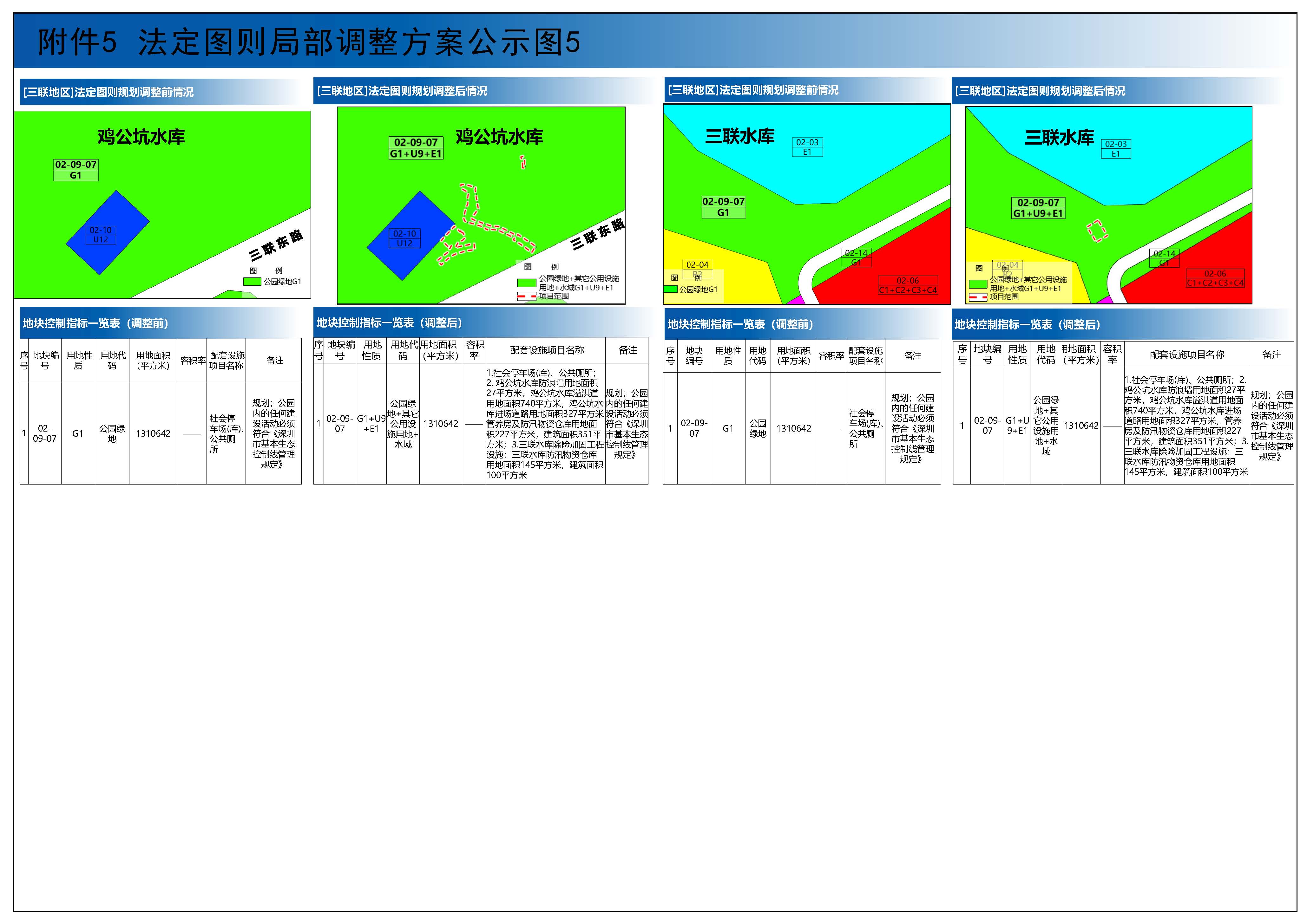 13.将[三联地区]法定图则02-09-07地块用地性质调整为公园绿地+其它公用设施用地+水域(G1+U9+E1),用地面积保持不变,容积率无,配套设施项目名称为“1.社会停车场(库)、公共厕所;2.鸡公坑水库除险加固工程设施:鸡公坑水库防浪墙用地面积27平方米,鸡公坑水库溢洪道用地面积740平方米,鸡公坑水库进场道路用地面积327平方米,管养房及防汛物资仓库用地面积227平方米,建筑面积351平方米;3.三联水库防汛物资仓库用地面积145平方米,建筑面积100平方米”,备注为“规划;公园内的任何建设活动必须符合《深圳市基本生态控制线管理规定》”。
