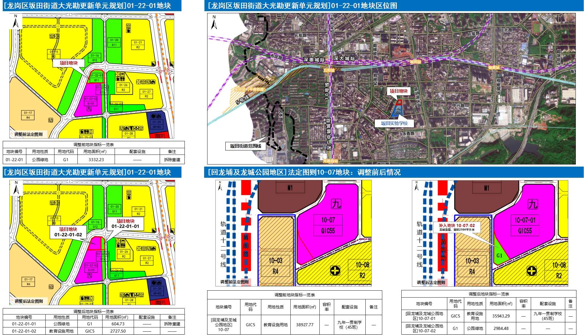 (一)本次规划调整将原[龙岗区坂田街道大光勘更新单元规划]01-22-01公园绿地(G1)调整为两块用地,分别为教育设施用地(GIC5),用地面积2727.5平方米;公园绿地(G1),用地面积604.73平方米,备注“拆除重建”。