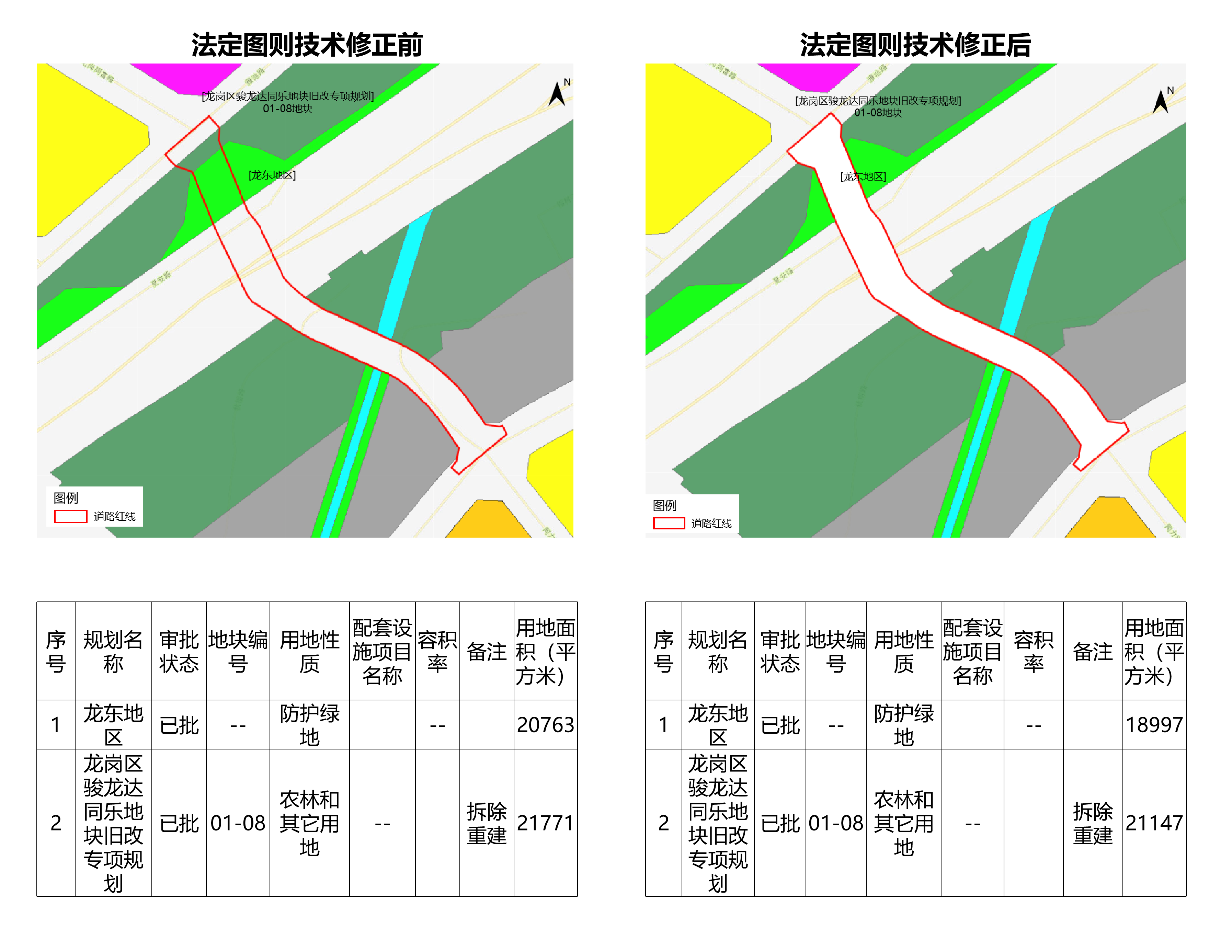 项目与《龙东地区-法定图则》重叠地块规划用地性质为防护绿地(G2),用地面积18997平方米;《龙岗区骏龙达同乐地块旧改专项规划-城市更新》01-08地块,规划用地性质为农林和其它用地(E2),用地面积21147平方米,备注为“拆除重建”。