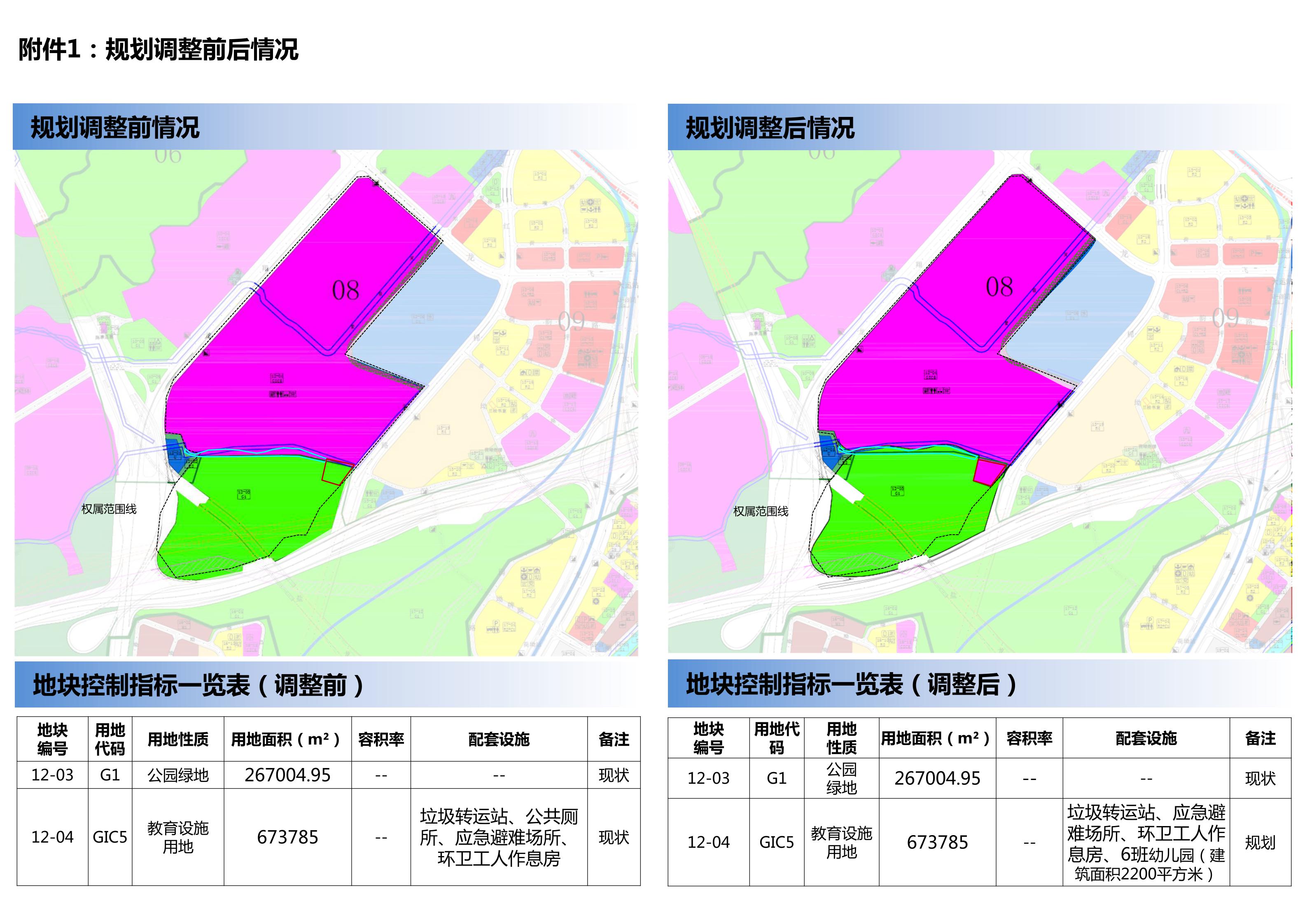 本次拟申请在保持原地块面积不变的原则下,对12-03、12-04地块的用地范围进行优化调整,调整面积为10000平方米(详见附件1)。调整后法定图则规划情况如下: