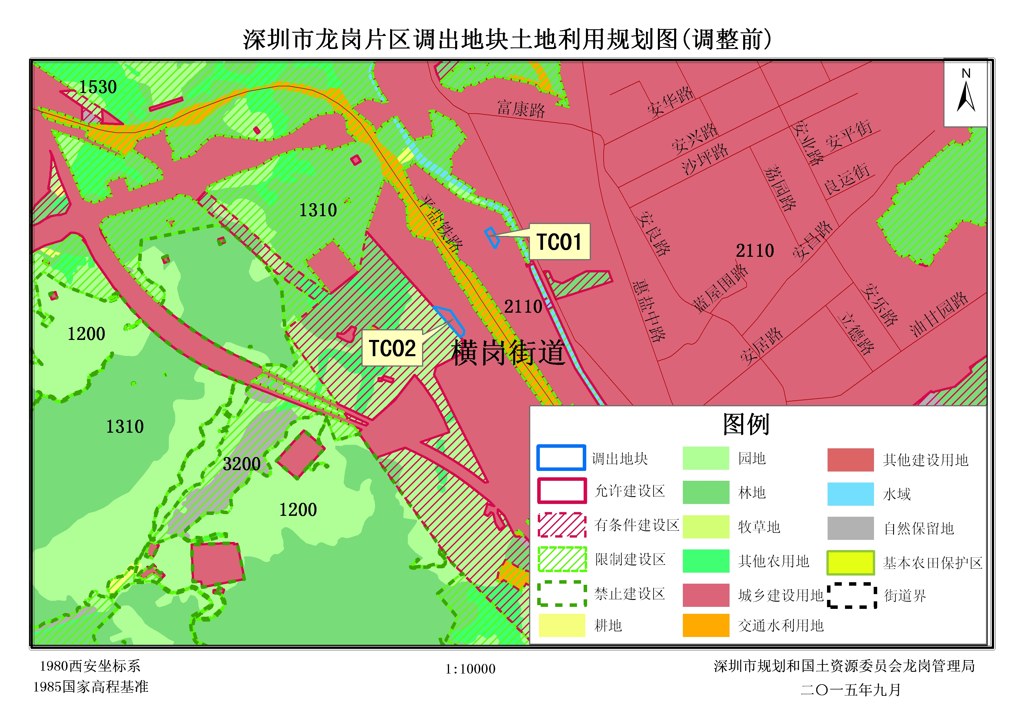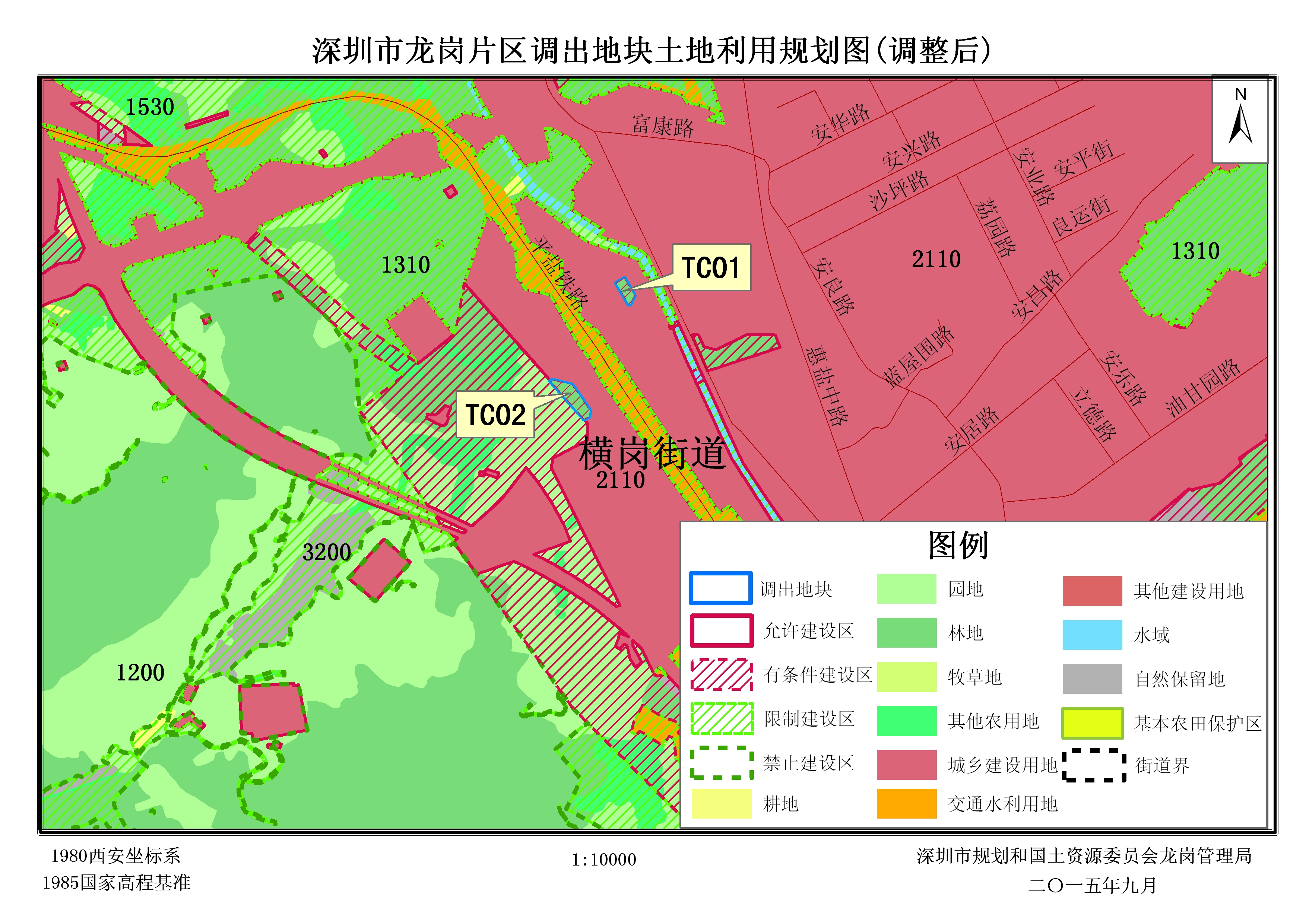 (二)调出地块共2块,面积共3722.93平方米,调出地块01、02(TC01、TC02)均位于龙岗区横岗街道安良社区,面积分别为1081.10平方米和2641.83平方米。经核查深圳市2014年土地利用变更调查,调出地块01(TC01)和调出地块02(TC02)现状全部为农用地(林地和园地)。经核查《深圳市土地利用总体规划(2006-2020)》,调出地块在土地利用规划图中全部为城乡建设用地(即允许建设区)。根据[横岗大康-安良片区]法定图则,调出地块01、02(TC01、TC02)规划用地性质分别为生产防护绿地(G2)和林地(E4)。用地情况:经核查深圳市历年农用地转用方案以及农用地转用实施方案,调出地块均未经批准为建设用地,未见出让等相关用地手续。
