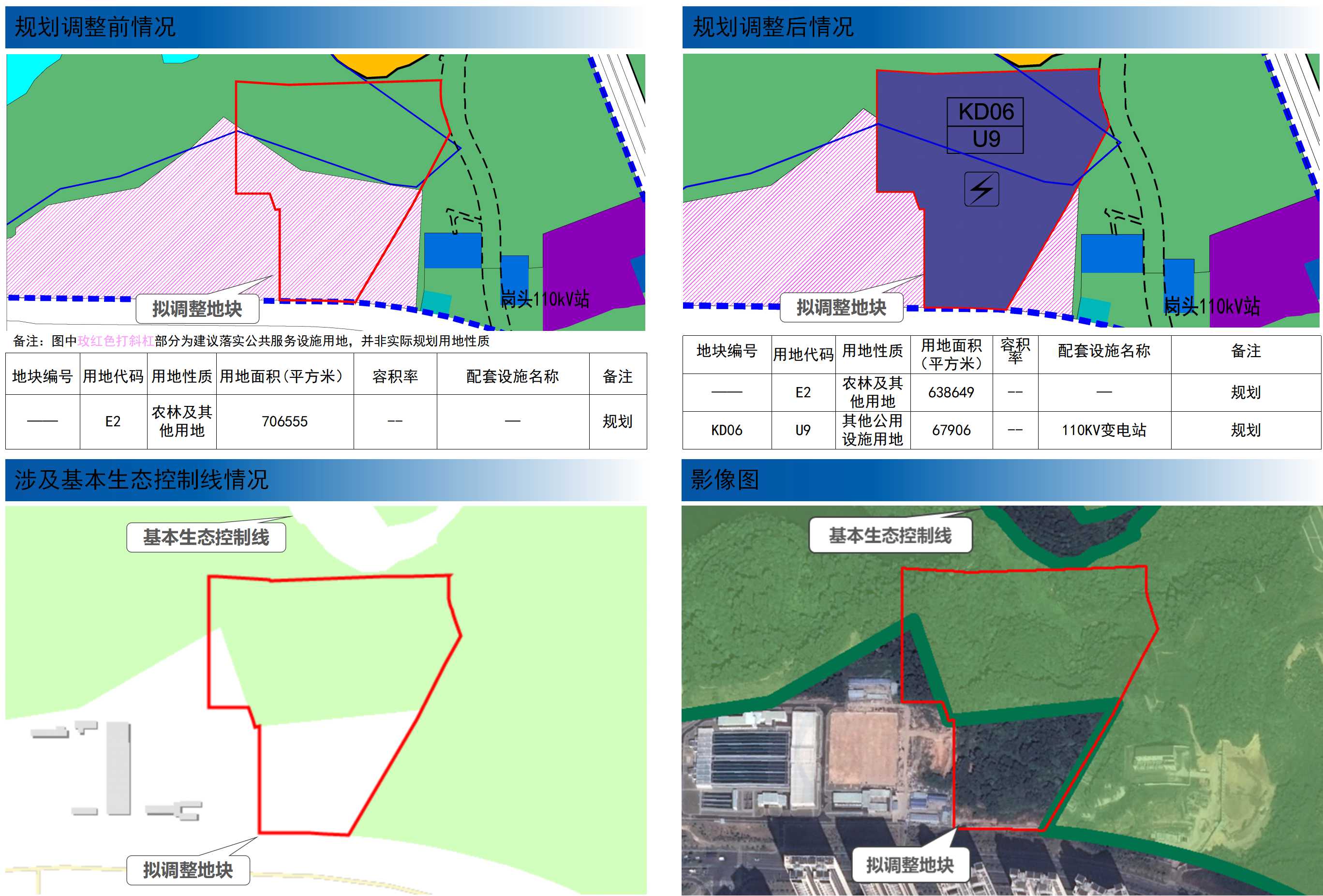 拟调整地块用地面积为67906平方米,用地性质由农林和其他用地(E2)调整为其他公用设施用地(U9),配套设施110KV变电站,备注:规划。