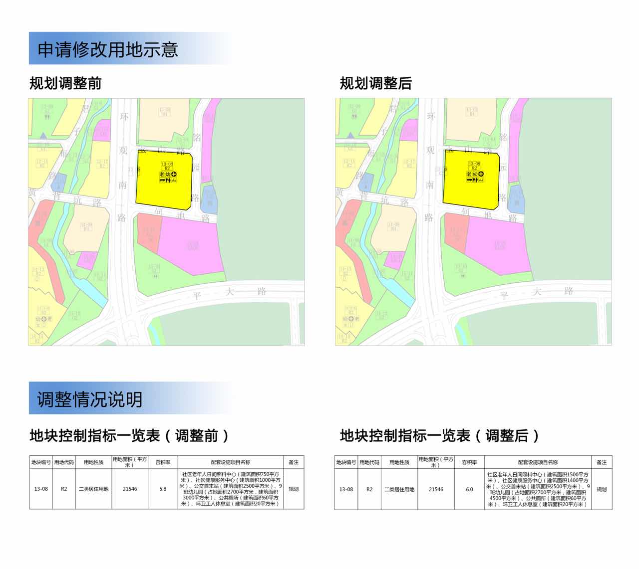 13-08地块容积率调整为“6.0”,配套设施项目名称调整为“社区老年人日间照料中心(建筑面积1500平方米)、社区健康服务中心(建筑面积1400平方米)、公交首末站(建筑面积2500平方米)、9班幼儿园(占地面积2700平方米,建筑面积4500平方米)、公共厕所(建筑面积60平方米)、环卫工人休息室(建筑面积20平方米)”,其余维持原图则不变。