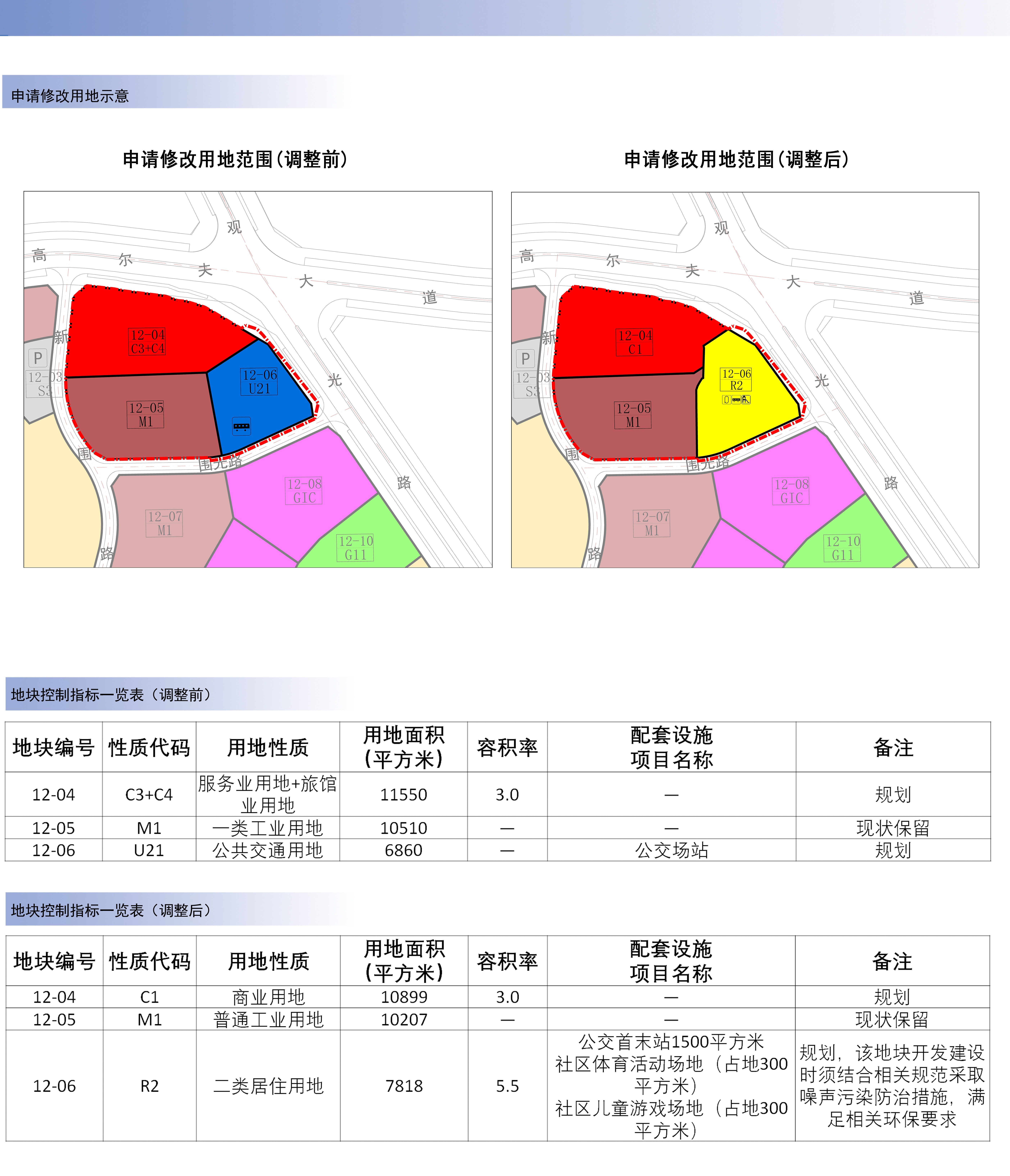 1.将12-04地块规划用地性质由服务业用地+旅馆业用地(C3+C4)表达为商业用地(C1),用地面积由11550平方米调整为10899平方米,其余指标不变。