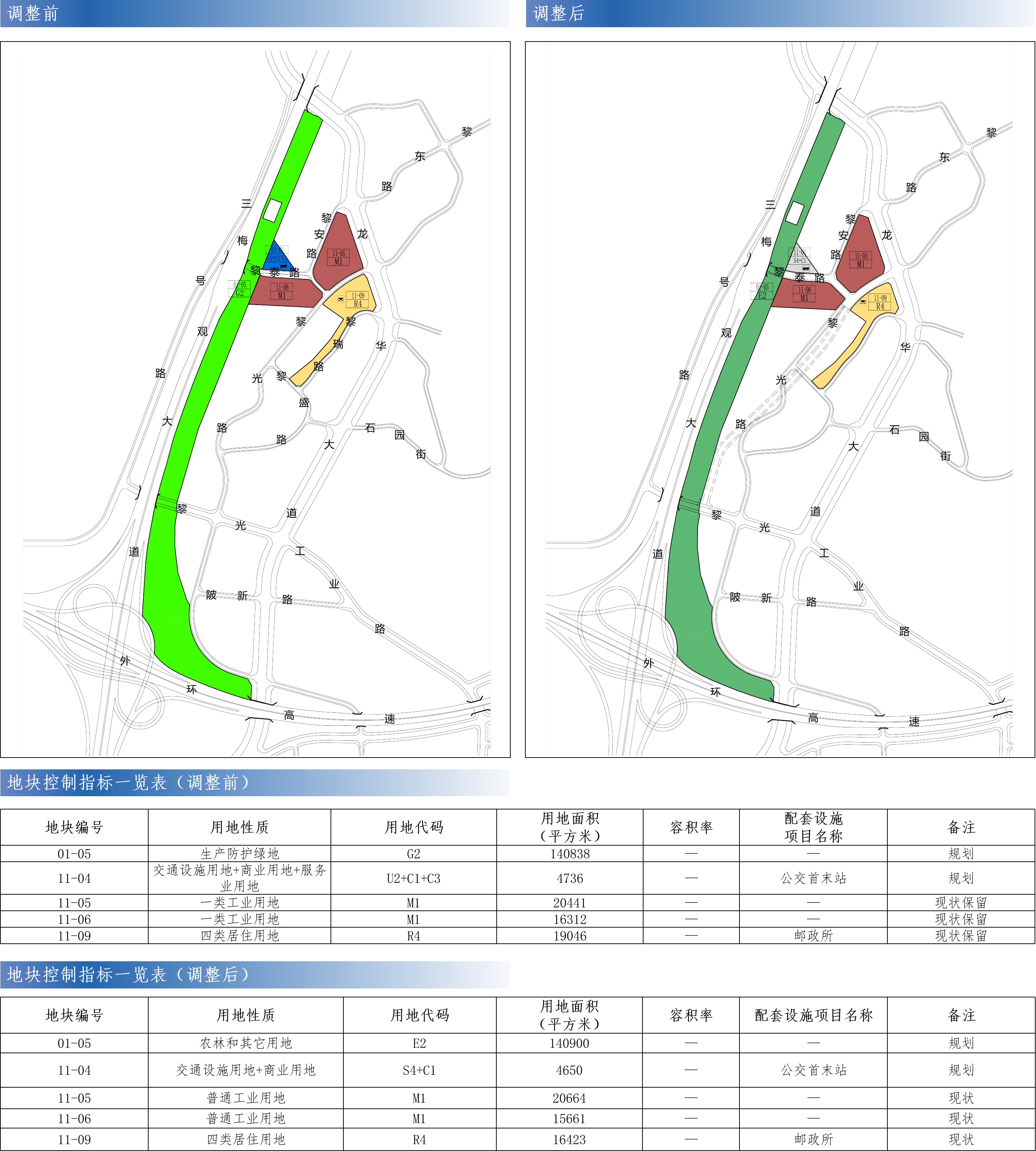 详见调整前后地块规划控制指标一览表及附图。