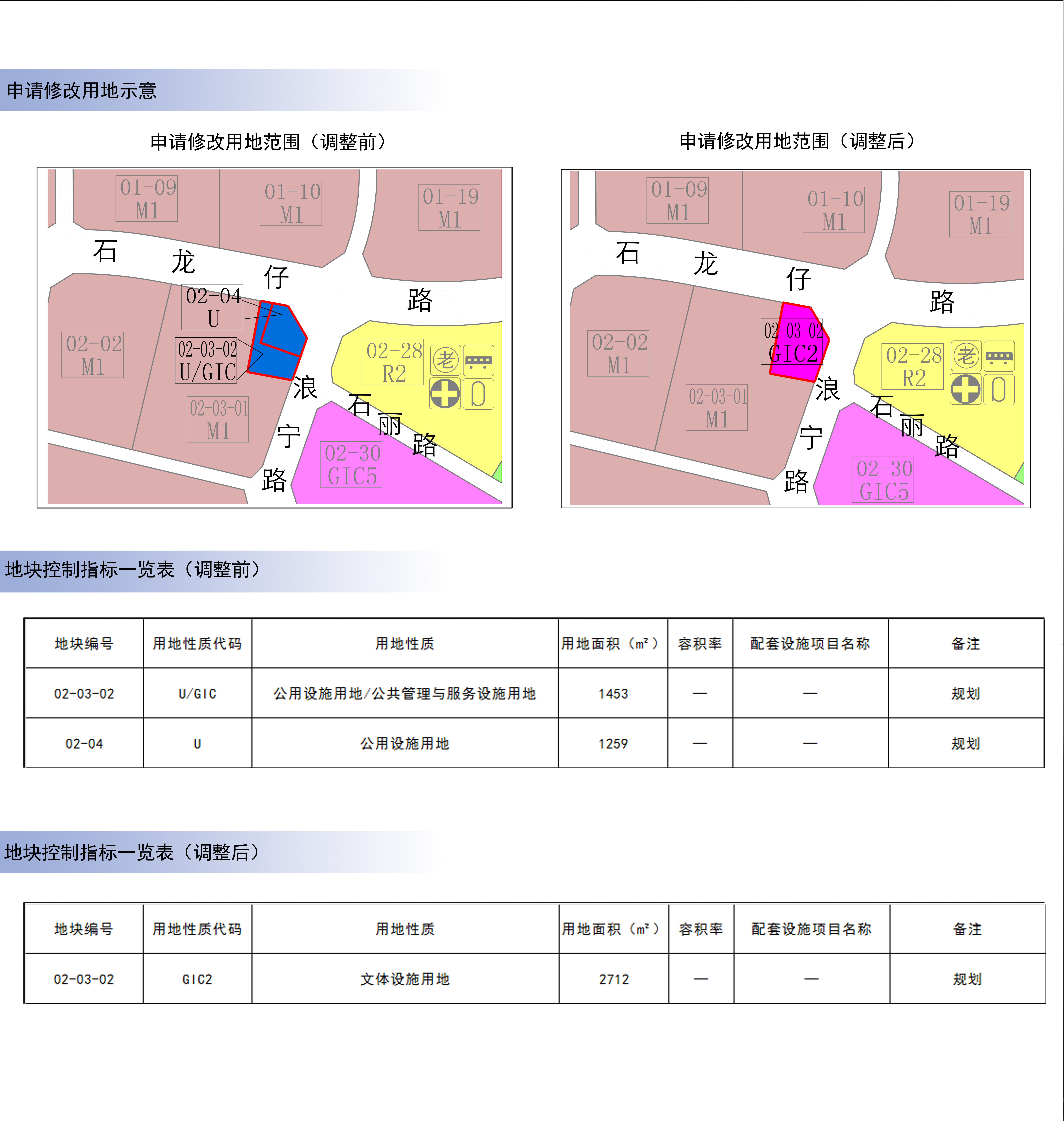 根据已批准的[大浪石凹片区]法定图则,02-03-02地块用地面积为1453平方米,规划用地性质为公用设施用地/公共管理与服务设施用地(U/GIC),容积率“-”,配套设施项目名称“-”,备注“规划”;02-04地块用地面积为1259平方米,规划用地性质为公用设施用地(U),容积率“-”,配套设施项目名称“-”,备注“规划”。