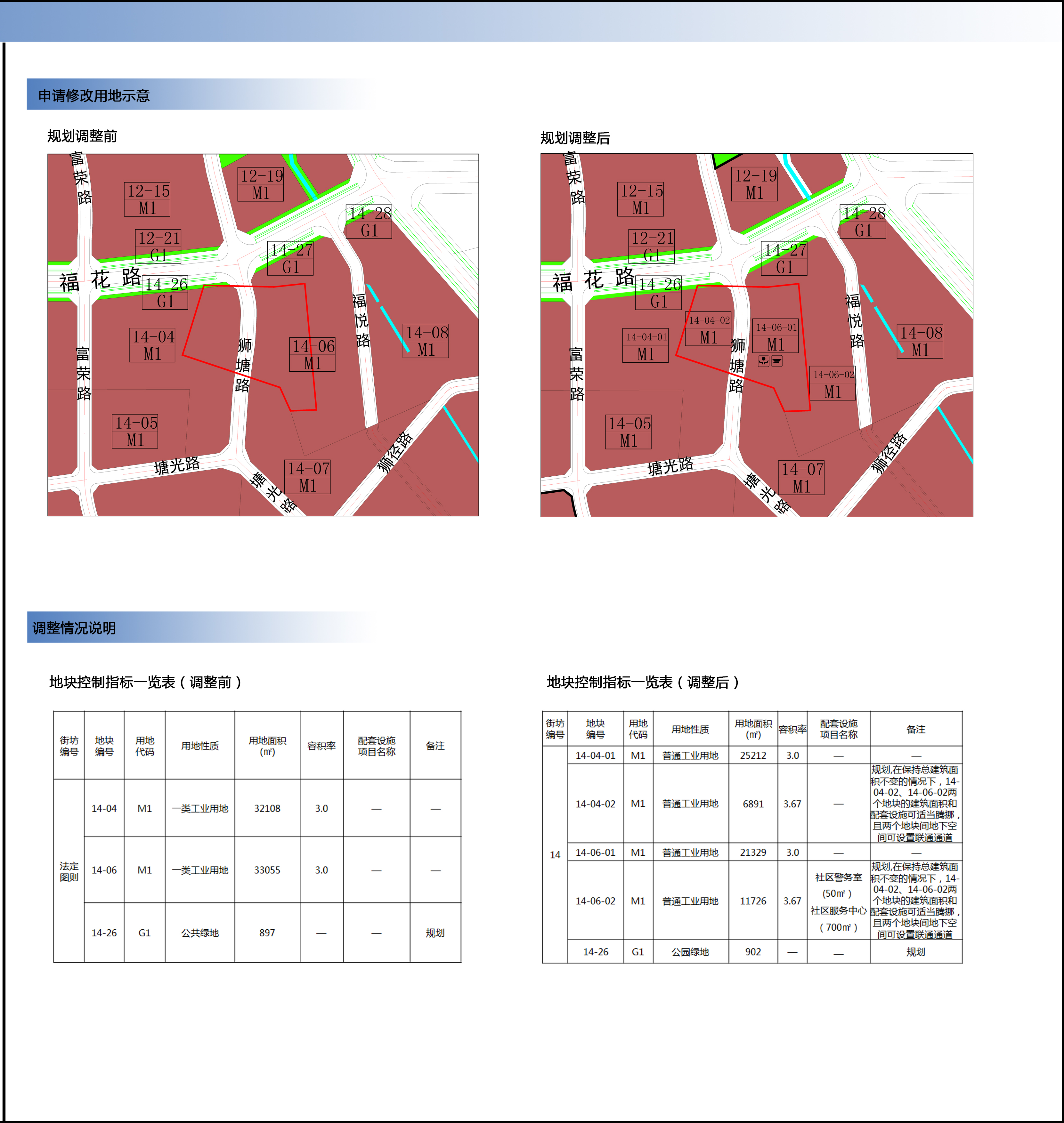 调整后,将14-04地块拆分为14-04-01地块和14-04-02地块。其中14-04-01地块,用地面积为25212平方米,规划用地性质为普通工业用地(M1),其余规划指标不变;14-04-02地块用地面积为6891平方米,规划用地性质为普通工业用地(M1),容积率为“3.67”,备注为“规划。在保持总建筑面积不变的情况下,14-04-02、14-06-02两个地块的建筑面积和配套设施可适当腾挪,且两个地块间地下空间可设置连通通道”,其余规划指标不变;将14-06地块拆分为14-06-01地块和14-06-02地块。其中14-06-01地块用地面积为21329平方米,规划用地性质为普通工业用地(M1),其余规划指标不变;14-06-02地块用地面积为11726平方米,规划用地性质为普通工业用地(M1),容积率为“3.67”,配套设施为“社区警务室50平方米、社区服务中心700平方米”,备注为“规划。在保持总建筑面积不变的情况下,14-04-02、14-06-02两个地块的建筑面积和配套设施可适当腾挪,且两个地块间地下空间可设置连通通道”;将14-26地块用地面积由“897平方米”调整为“902平方米”,规划用地性质为公园绿地(G1),其余规划指标不变。