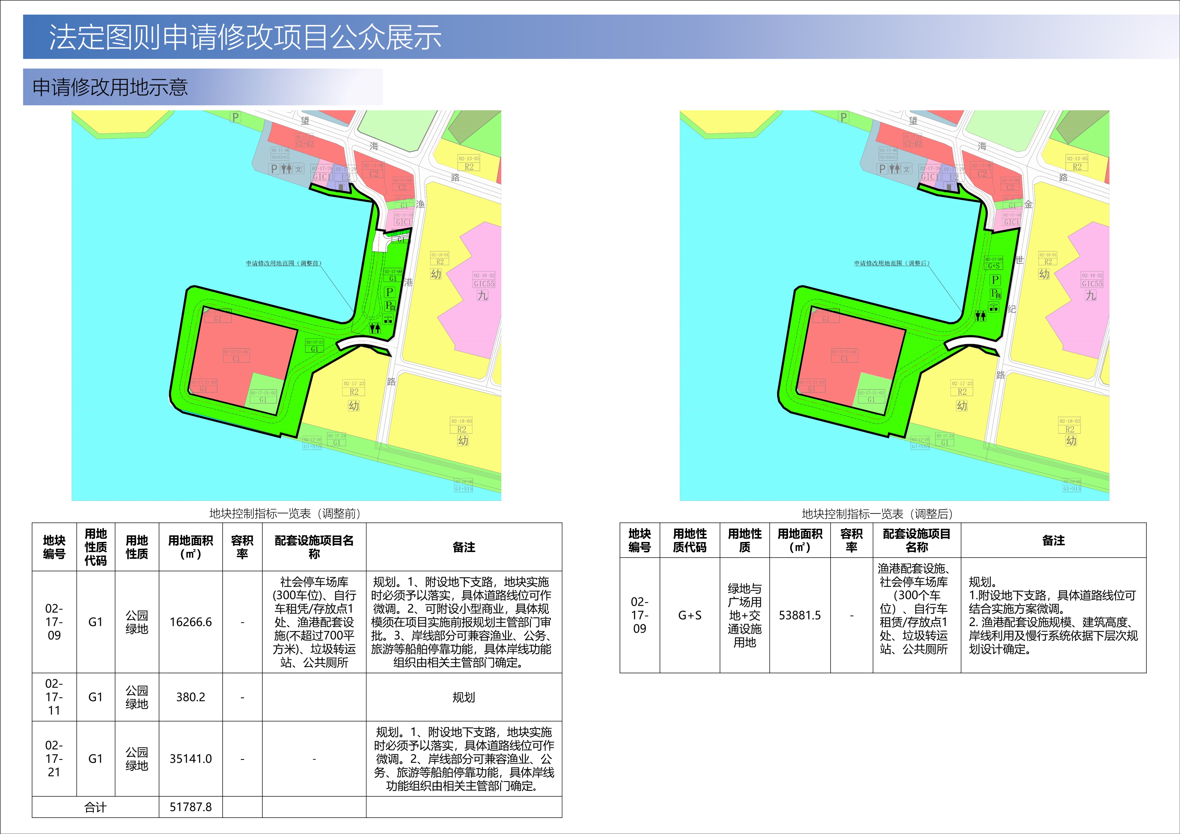 2.将[蛇口地区]法定图则02-17-09、02-17-11、02-17-21地块及上述道路线位优化部分整合为一个地块,地块编号02-17-09,用地面积53881.5平方米,调整用地性质为绿地与广场用地+交通设施用地,配套设施为“社会停车场库(300车位)、自行车租赁/存放点1处、渔港配套设施、垃圾转运站、公共厕所”,备注为“规划。1.附设地下支路,具体道路线位可做微调。2. 渔港配套设施规模、建筑高度、岸线利用及慢行系统依据下层次规划设计确定。”