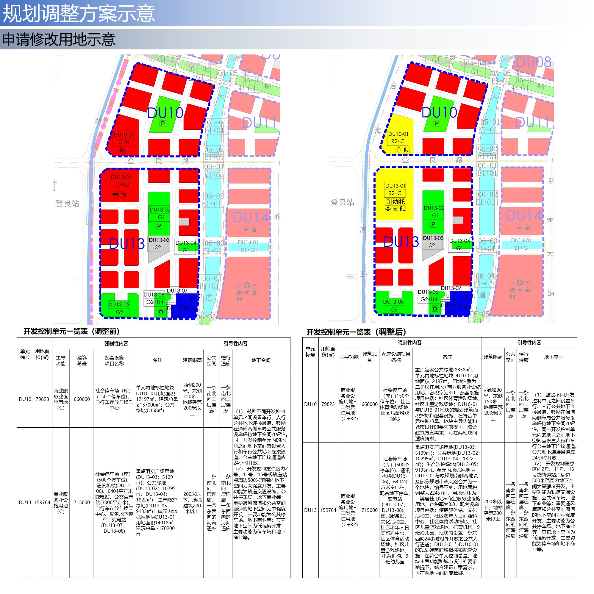 DU13单元主导功能调整为“商业服务业用地+二类居住用地(C+R2)”;配套设施调整为“社会停车场(库)(500个停车位)、通讯机楼(DU13-06)、6404平方米变电站、配备地下停车、变电站(DU13-07、DU13-08)、便民服务站、文化活动室、社区老年人日间照料中心、社区体育活动场地、社区儿童游戏场地、托育机构、9班幼儿园”;备注调整为“重点落实广场用地(DU13-03:5109㎡);公共绿地(DU13-02:10295㎡、DU13-04:1822㎡);生产防护绿地(DU13-05:9133㎡)。单元内地标性地块DU13-01与原规划南侧两地块及部分规划市政支路合并为一个地块,编号不变,用地面积调整为22457㎡,用地性质为二类居住用地+商业服务业设施用地,容积率为8.0,配套设施项目包括:便民服务站、文化活动室、社区老年人日间照料中心、社区体育活动场地、社区儿童游戏场地、托育机构、9班幼儿园;地块内设置一条东西向24小时对外开放的公共人行通道;DU13-01与DU10-01的规划建筑面积指标和配套设施,在符合单元控制总量、地块主导功能和城市设计要求的前提下,结合建筑方案需求,可在两地块间适度腾挪”。