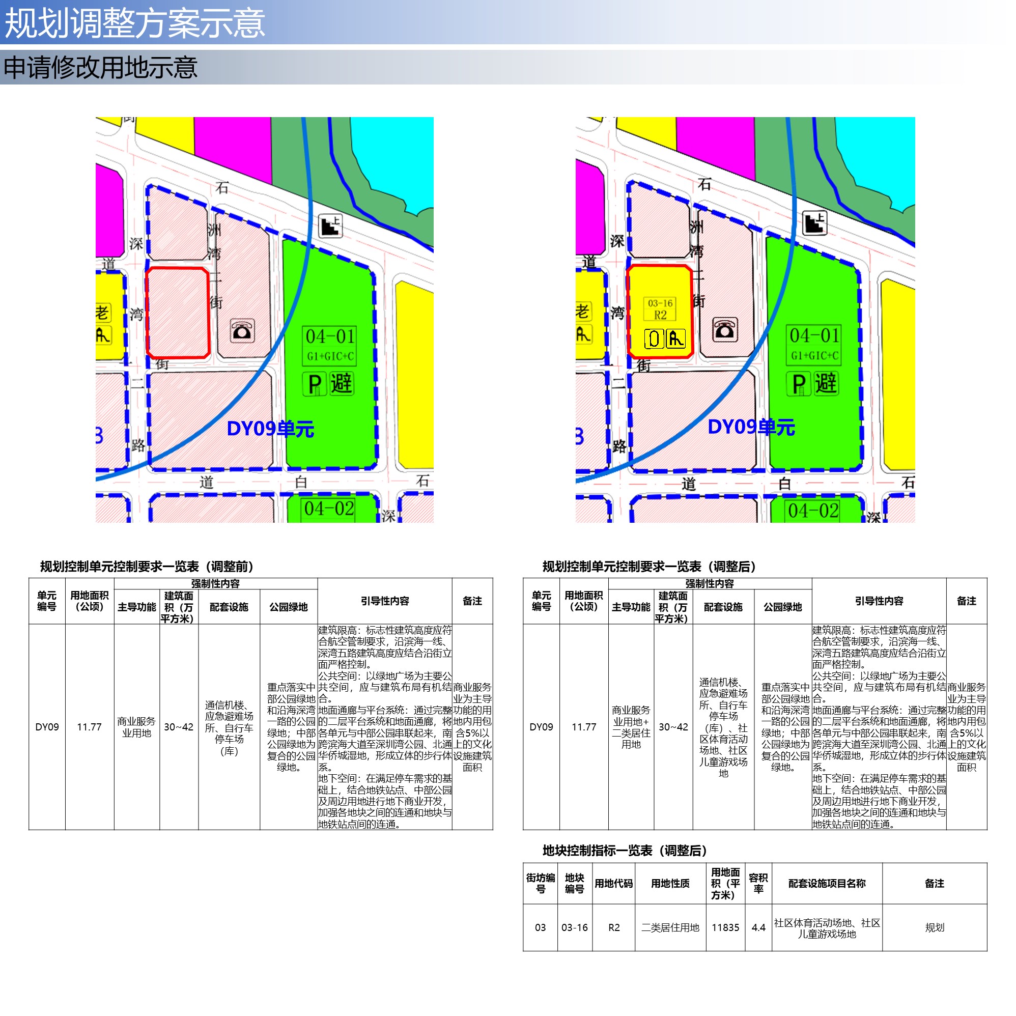 DY09单元主导功能调整为“商业服务业用地+二类居住用地”;配套设施调整为“通信机楼、应急避难场所、自行车停车场(库)、社区体育活动场地、社区儿童游戏场地”。