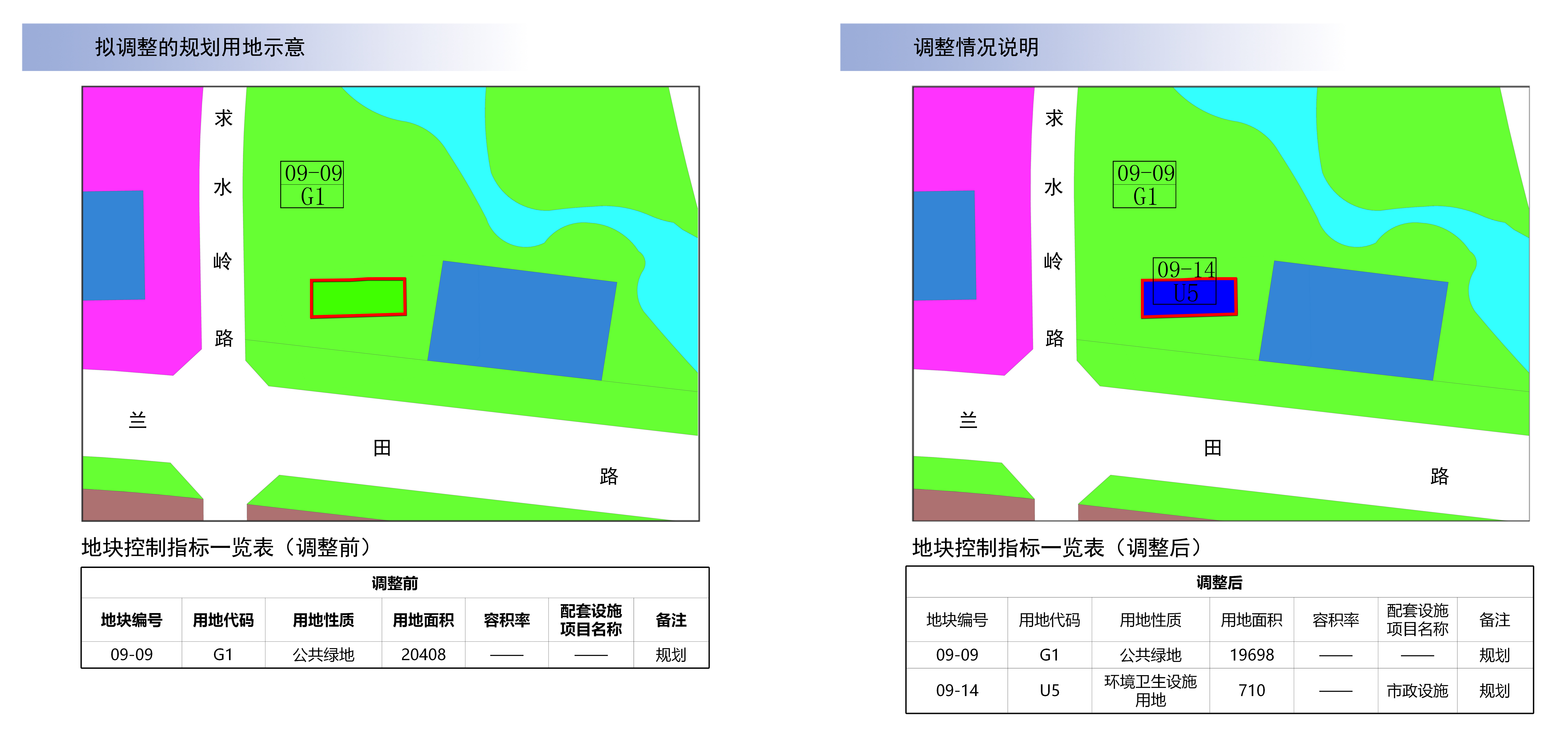 调整后,09-09地块重新整合划分为09-09、09-14两个地块,其中09-09地块用地面积由20408平方米调整至19698平方米,用地性质不变,备注:规划;09-14地块用地面积为710平方米,用地性质为环境卫生设施用地(U5),配套市政设施,备注:规划。