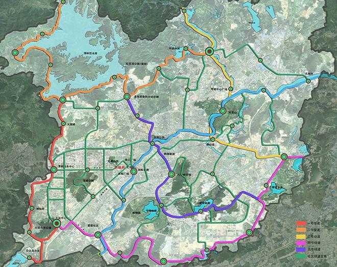 5号绿道为以龙岗河为依托贯穿横轴的滨水绿廊主线;