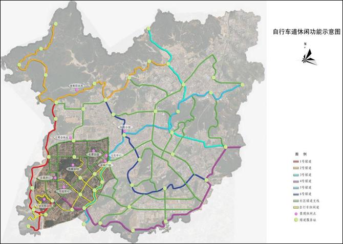 由于研究范围条件限制,本次并没有设置独立自行车专用道。部分廊道及集散道可以起到自行车休闲道功能,连接景观休闲区及绿道,充分考虑本次规划自行车休闲道与规划绿道、研究区域内及周边自然、人文景点的连接,本次规划自行车道网络休闲功能详见图6-7及附图12: