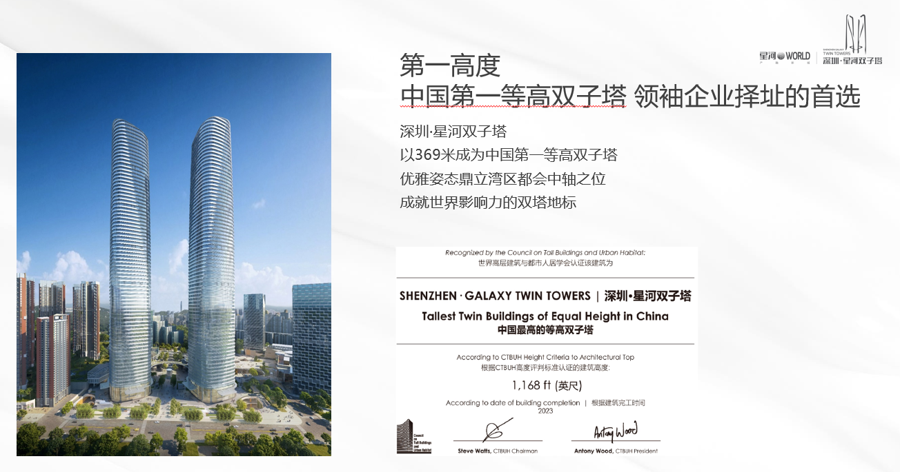深圳˙星河双子塔,地处深圳中轴之上,享都市核心区与世界级电子信息产业集群承载区双重区位势能,超级湾区都会与全球创新经济在此共生共融,打造多功能融合的城市活力中心和全球科创走廊,万亿级世界电子信息产业集群承载区,重点布局集成电路、云与计算、通信、智能终端、人工智能、智能汽车6大重点产业,由东西等高双塔组成,地上73层,双塔电梯共88部,时速达到30m/s,拥有直升机停机坪、空中企业总部大堂、共享会议中心、员工餐厅、VIP电梯等塔尖商务配套,IEO生态总部大厦,屋顶花园+多重绿色空间设计,领衔高端商务配置,助推企业进阶发展。