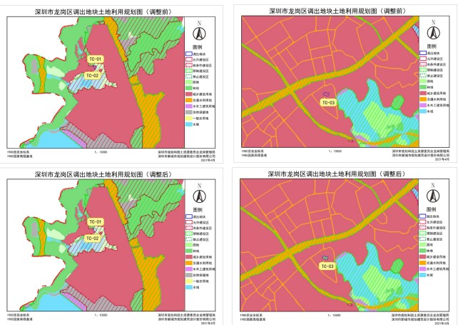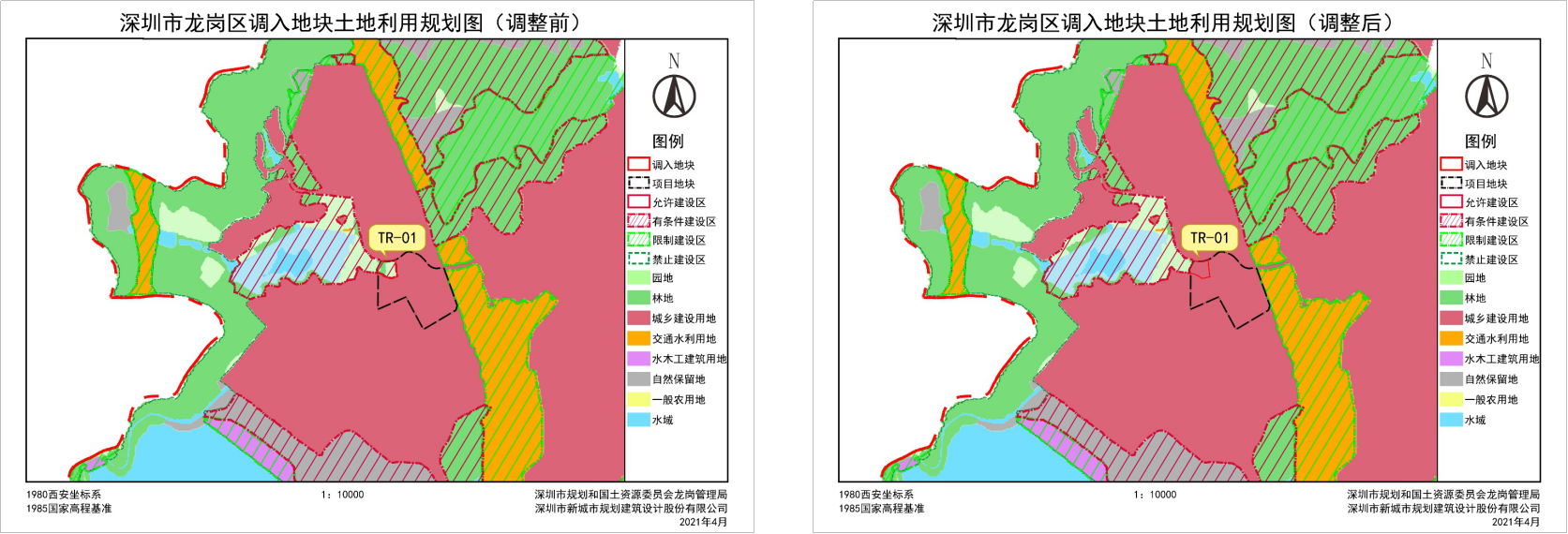 本次有条件建设区使用,调入和调出地块用地面积相等,在龙岗区范围内实现等面积置换,龙岗区范围内规划建设用地总规模没有增加,城乡建设用地指标没有突破,符合有条件建设区使用原则。本方案调入、调出地块调整前后土地利用总体规划图详见下方附图。